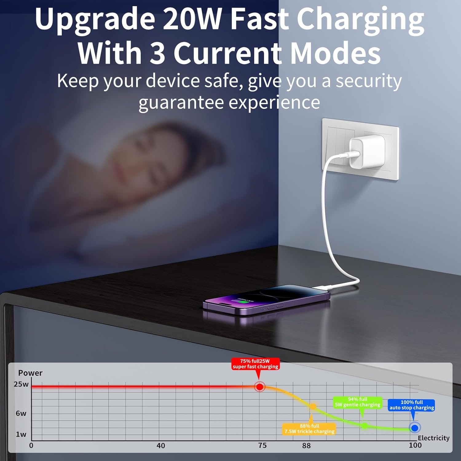 Upgrade fast charging technology with 3 current modes, after charging to 80% smart turn on trickle mode and charging will be auto-stopped when the device are fully charged. Enjoy more secure charging!