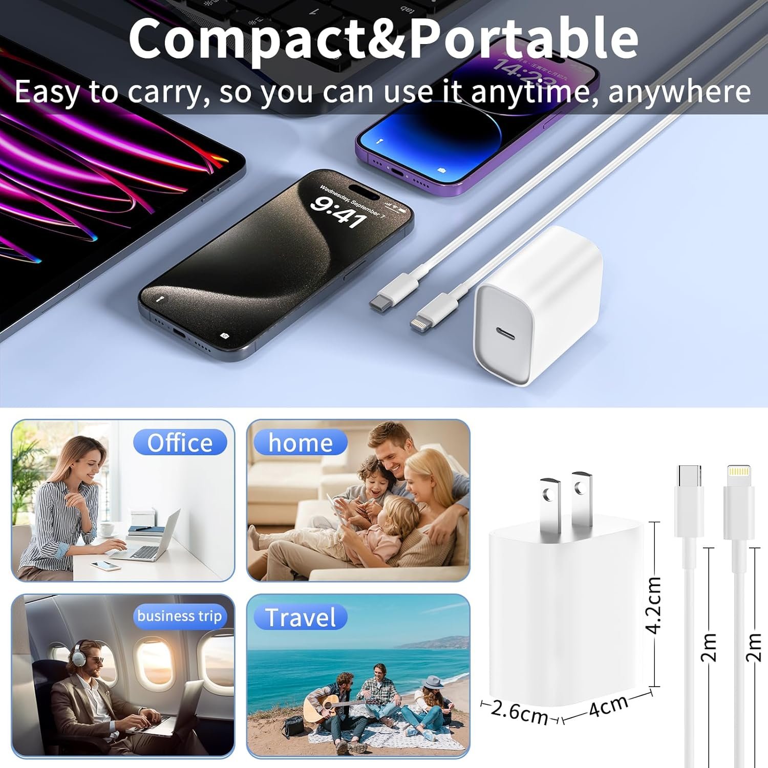 【Compact & Portable】This iphone charger is compact and lightweight, easily slips it into any of your pockets or bags, easy to carry. Suitable for travel, business trip, office and home use.