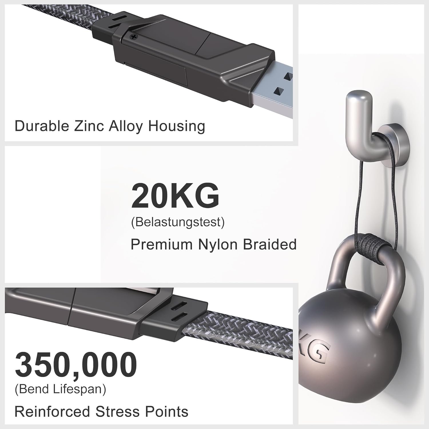 The 4 in 1 charging cable uses a zinc alloy shell and nylon braided wire to enhance heat dissipation, has a service life 30 times longer than ordinary cables, and is proven to withstand 35,000 bends in a laboratory environment. Flat cable with velcro attached keep everything in order on your desk