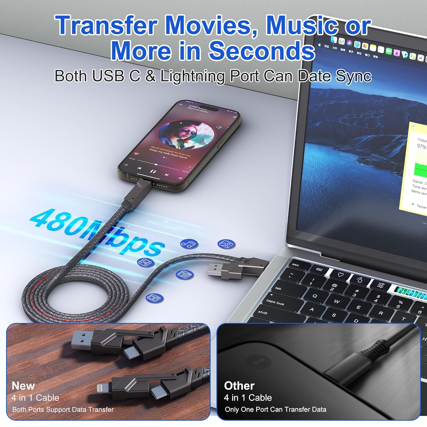 Switch between 4 modes at will;60W fast charging and stable connection;Support Apple Carplay & Android AutoZinc Alloy & Nylon cable is strong and durable;6.6 ft/2m optimal cable length;USB C/Lightning connectors Support 480Mbps data transfer;USB-A+Type-C input supports switching chargers of different ports.