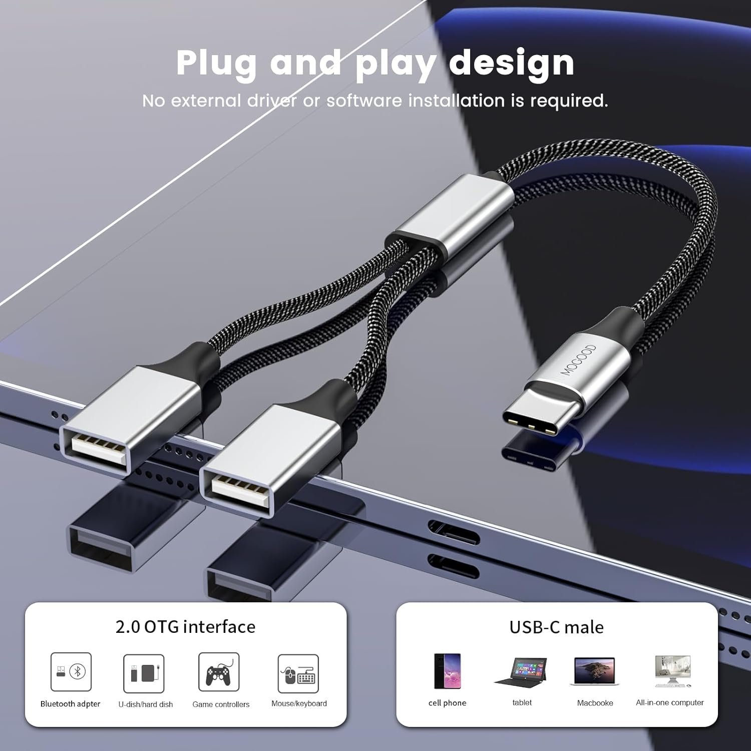 【Plug & Play】:This usb c Male to dual USB Female adapter reversible USB Type C connector. Plug and play design. No external driver or software installation needed.