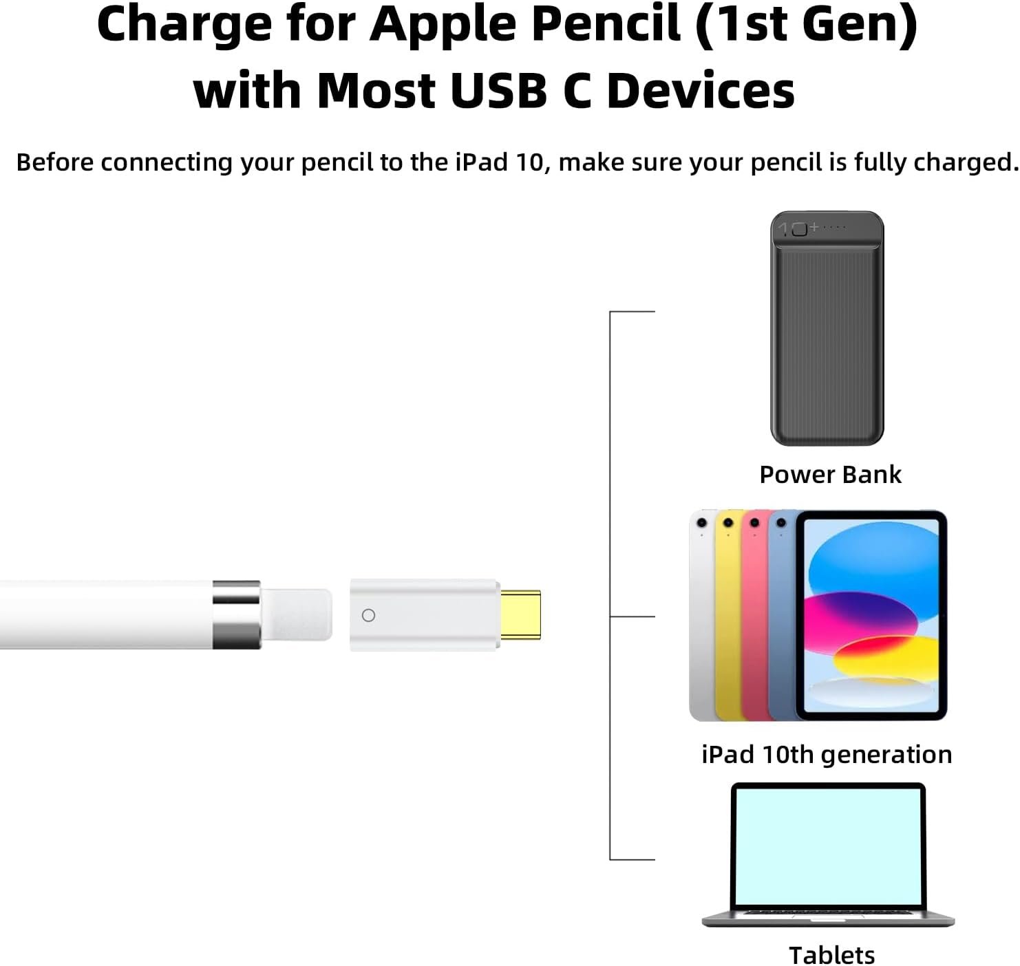 【Specially Designed for Pencil 1st Gen】This adapter is only suitable for Apple pencil (1st generation) and is not designed for cable extenders or data transfer! Before connecting your pencil to the iPad 10, make sure your pencil is fully charged. If the battery is low, please charge it first.