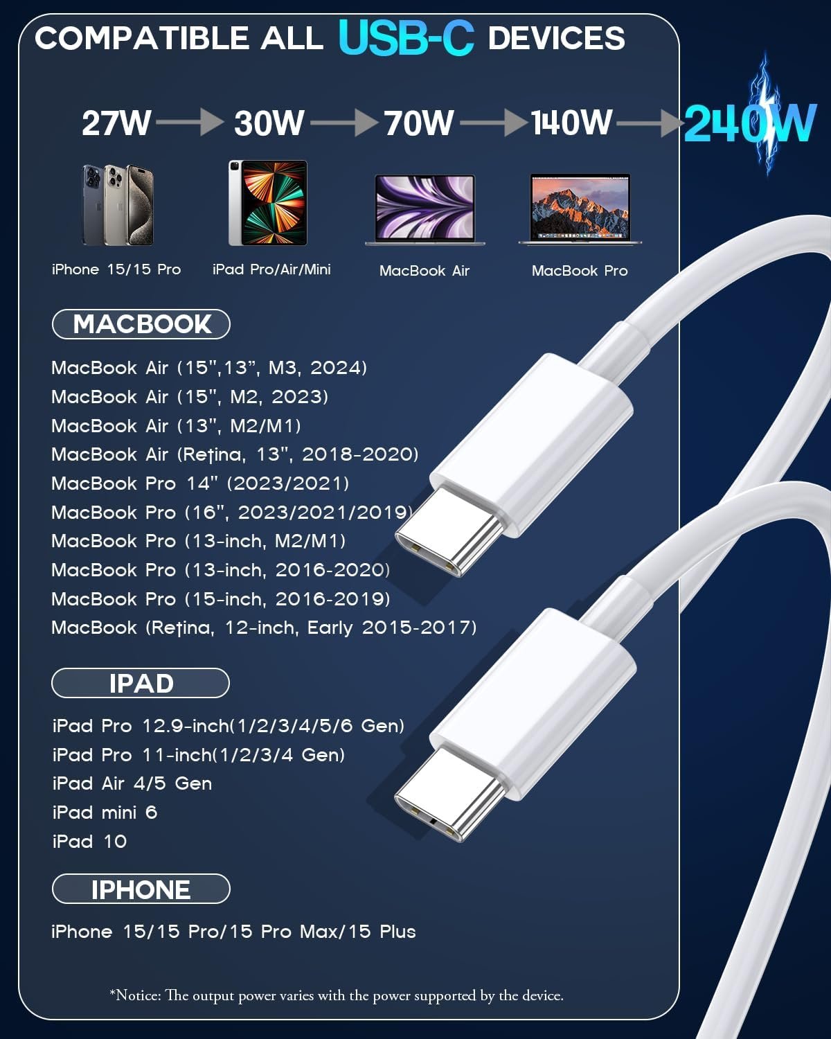 [ COMPATIBLE WITH ALL USB-C DEVICES ] 240W C to C cable fast charging supports USB PD3.0 fast charging, charges your MacBook and new iPhone 15 series as fast as official Apple 240W cable, widely compatible with MacBook Air (15″, M2), MacBook Air (13″, M2/M1/Retina), MacBook Pro (14″/16″,M3),MacBook Pro (13″, M2/M1), MacBook Pro (13″/15″), MacBook (Retina, 12″), iPad Air 4/5,iPad Mini 6,iPad Pro 11″ 1/2/3/4,iPad Pro 12.9″ 3/4/5/6,iPhone 15/15 Pro/15 Plus/15 Pro Max and other usb c devices