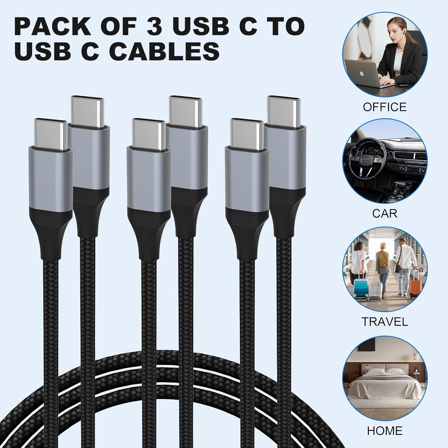 Perfect length combination:3ft USB C to USB-C cable*1 pack + 6ft USB C to USB-C cable*2 pack, suitable for charging at various distances! Meet all your usage occasions, such as home, office, or car.