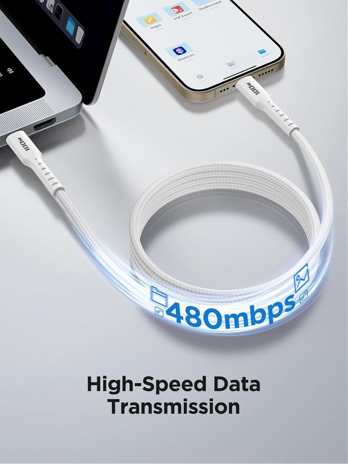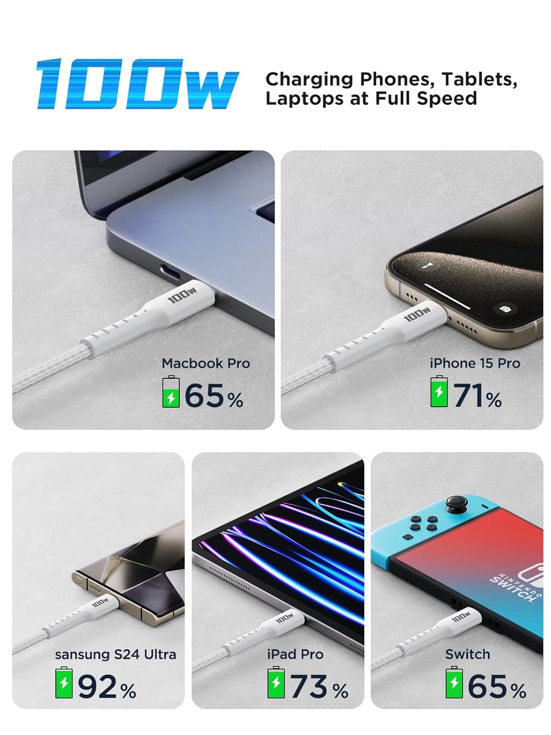 【100W/5A PD Fast Charging for iPhone 15】With our 2024 Upgrade PD 100W USB C to C cable charges your iPhone 15 to 71% in 30 minutes. your MacBook Pro 16” to 60% in just 45mins—that’s 58% faster than a 60W cable, and charge Samsung S24/S23 up to 92% in 35mins. (NOTE: The actual charging speed depends on your device and wall charger.)