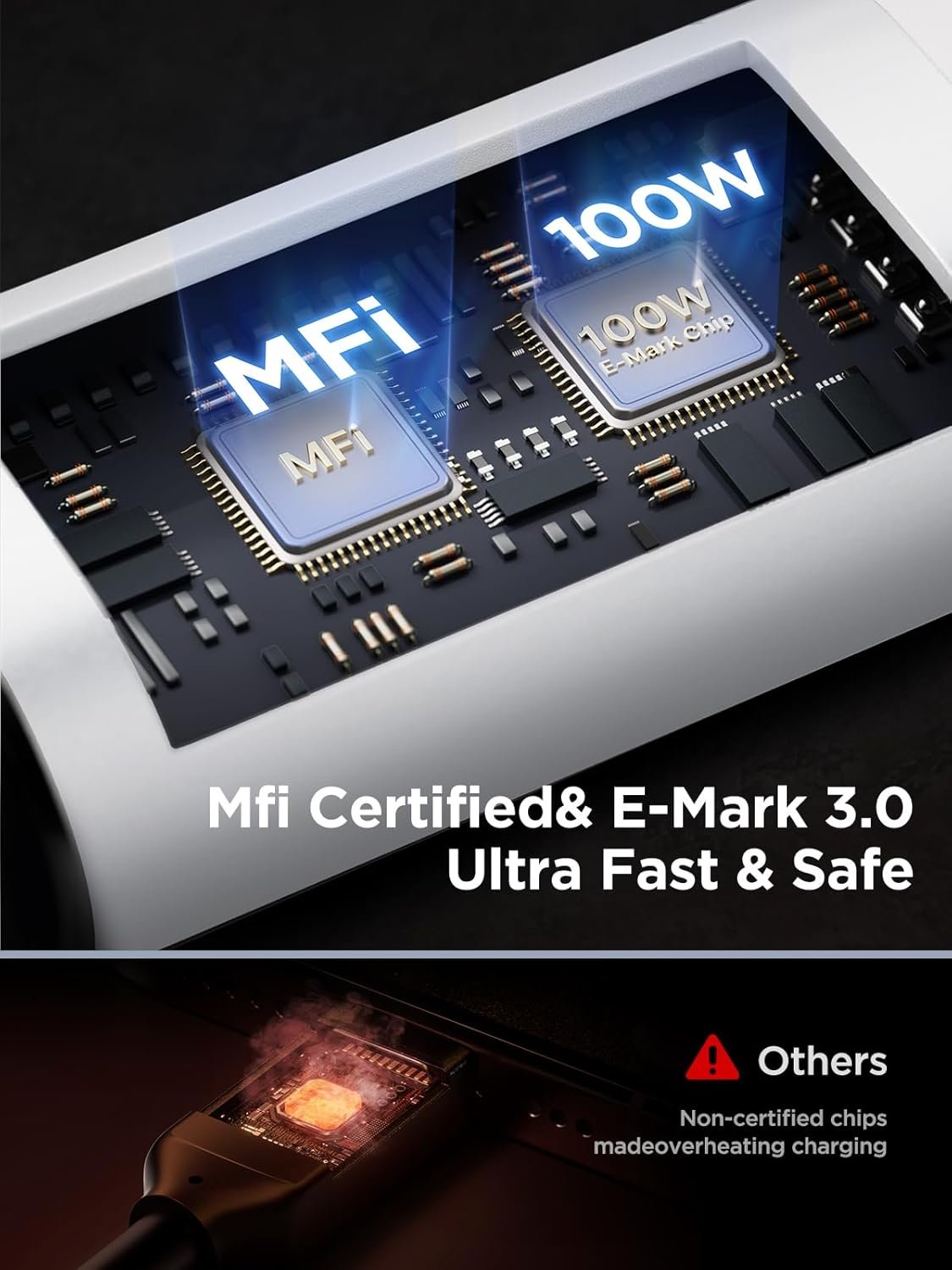 【MFI Certified & Emark Chip】Multiple built in safeguards with these USB C to C Charger cable. Our usbc to usbc cable has passed MFi Certified to ensure 100% compatibility with iPhone iPhone 15, 15 Pro, 15 Plus, 15 Pro Max. and Aioneus 100W super fast charging USB C cable is build in the best power delivery E-Mark chip, which supports USB PD fast charging and provides comprehensive protection to devices battery and adapters, keep you in light-speed charging and safe.