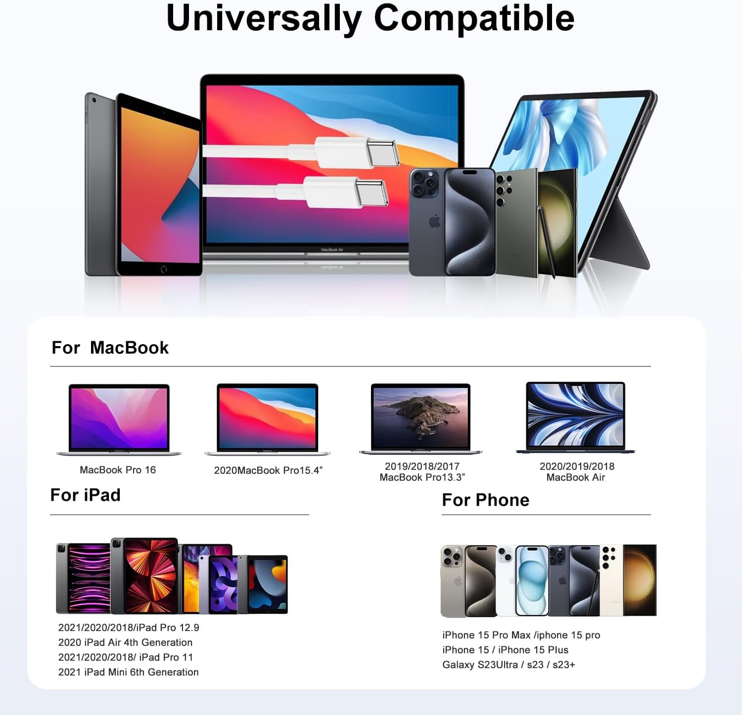 Universal Compatibility: This usb c to c cable Compatible with 65W /61W /45W /35W /30W /25W /22.5W /20W /18W /15W/12W All USB C charger. widely compatible with iPhone 16/16Pro/16Plus/16Pro Max/15/15 Plus/15 Pro/15 Pro Max, MacBook Pro 13 inch, Macbook Air 13 /m1 Inch, MacBook 12 inch, Pad Pro 12.9/11 inch, Pad Air 4/5, Pad Mini 6, Google Pixel 6/6 Pro/5/5a, Galaxy S24/S23/S22/S21/S20/S20+/S20 Ultra, Galaxy A53/A73/A71,Galaxy Note 10/10+/20 Ultra, Switch, PS5 and other USB-C port devices