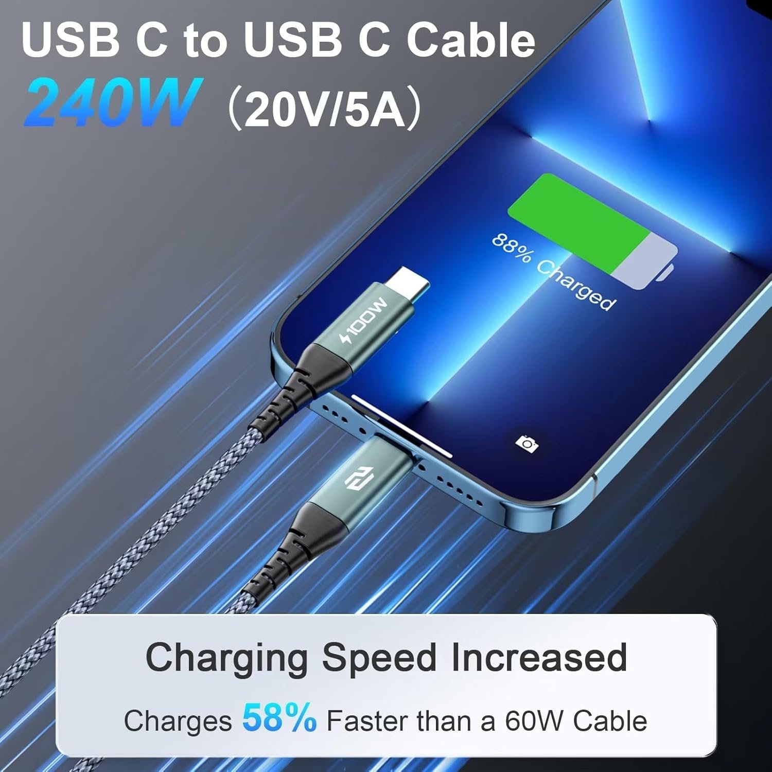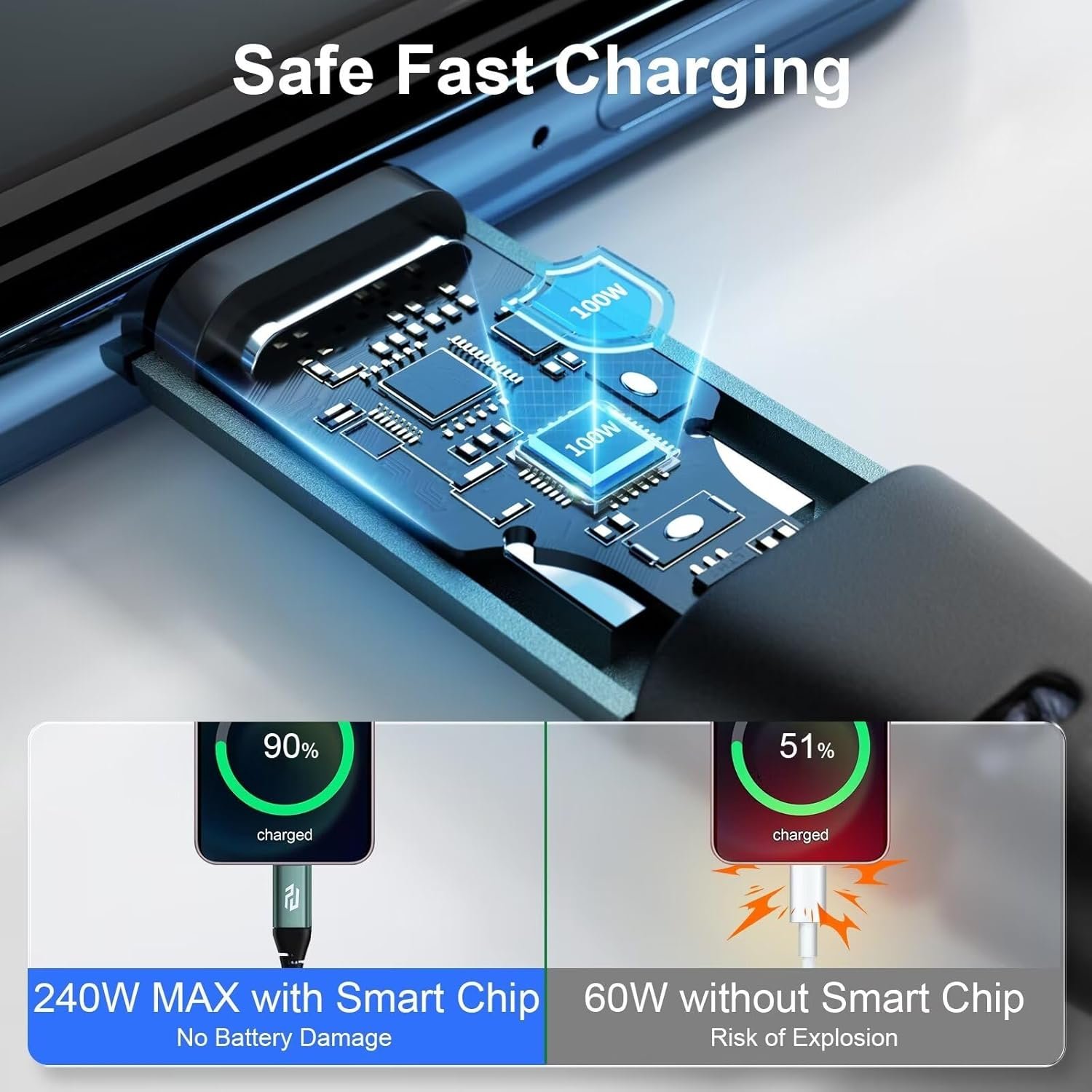 Our 100W-240W PD tech takes charging speed to the next level. Incredibly fast fuel your Phone 15 to 90% in just 30 mins—that faster than a 60W cable.With the powerful 240W output, it charges an even wider range of devices than those 60W cables.