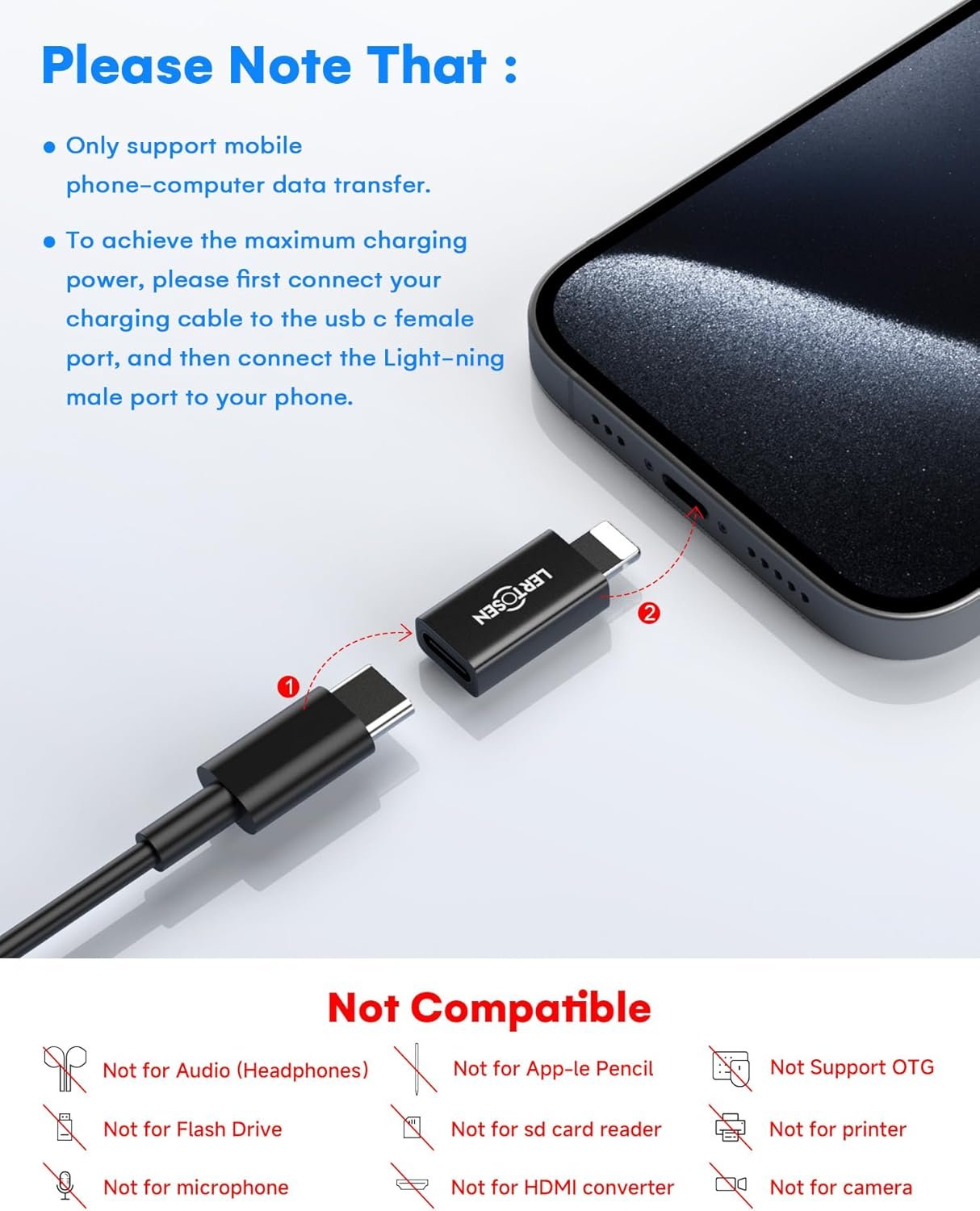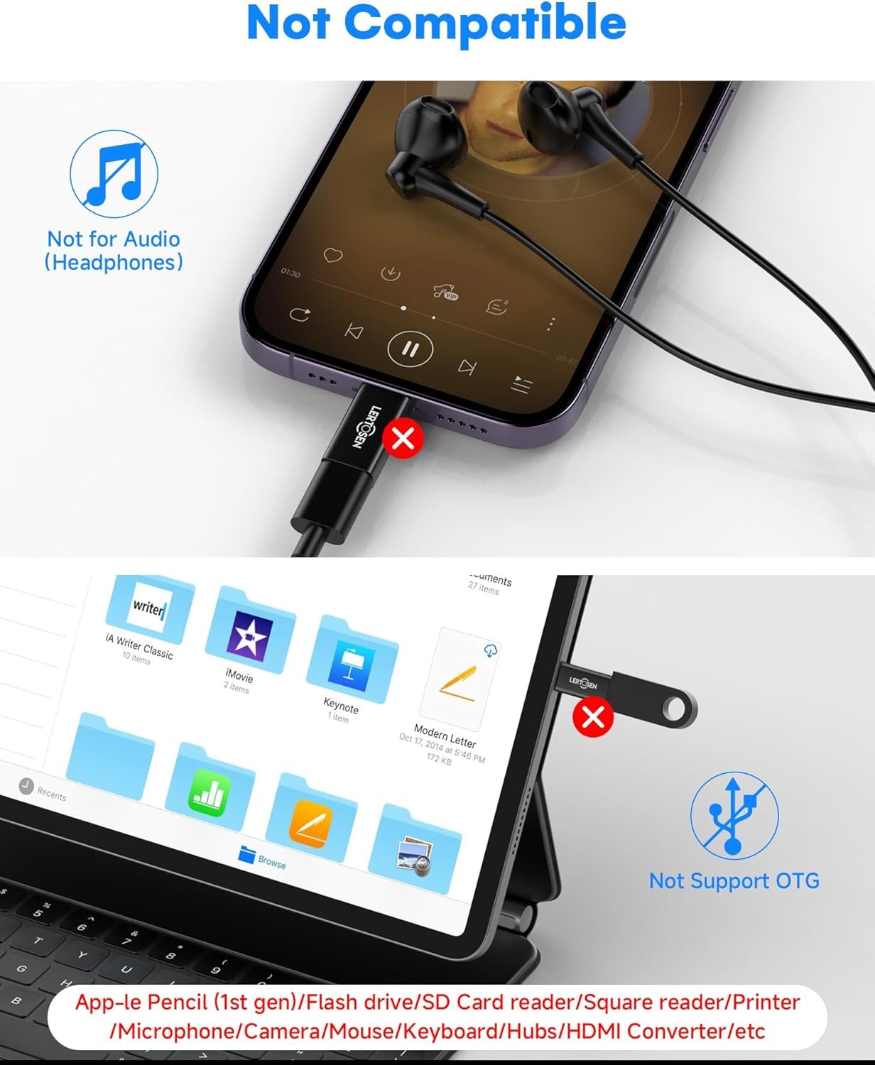 Attention Please :This usb c to iphone adapter is NOT Compatible with OTG(On-The-Go)Devices, Android devices, Headphones, Audio, Car Play, SD Card Reader, Square reader, App-le Pencil (1st gen),USB Flash Drive, MIDI Keyboard, Mouse, U Disk, Hubs, Microphone,Printer, Camera,Mouse,HDMI converter etc