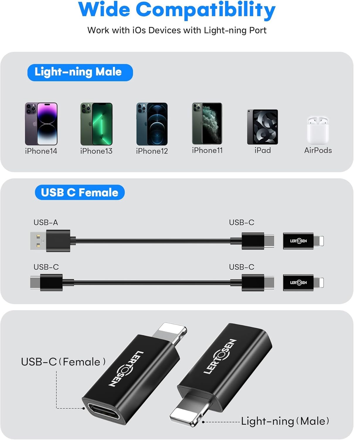 Supports ONLY iPhone/iPad and Computer Data Transfer:The usbc to light-ning adapter for iphone provides up to 480 Mbps data transfer speed,only supports data transfer between the phone and computer, no data sync for any other devices.The type c to light-ning cable adapter is compatible with iPhone 14, 13, 12, 11/11 Pro/11 Pro Max, Xs/Xs Max/Xr, X/8/8 Plus, iPhone Se/New Se/7/7 Plus/6/6 Plus/6s/6s Plus/5/5c/5s, iPad Pro 10.5′, iPad Pro 12.9′, iPad 5, iPad 4, iPad Air 2, iPad Air, iPad Mini 3, iPad Mini 2, iPad Mini Retina, iPod Nano 7, iPod Touch 5, AirPods, etc