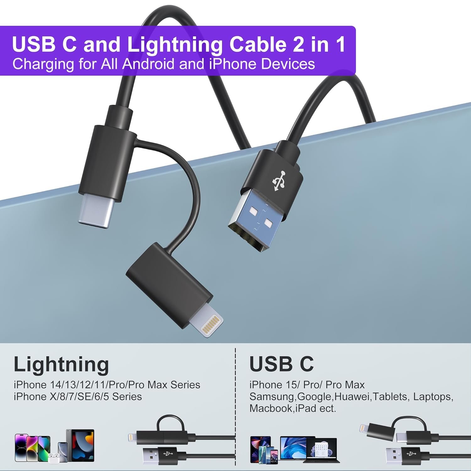 USB C Cable Lightning Cable 2 in 1 : The multi charging cable was designed with the idea of simplifying your life. It combines USB to USB C and USB to Lightning in one cable. Best for you if you have the latest iPhone 15 and previous iPhone Lightning devices or Android phones. No need to carry multiple cables for different devices.