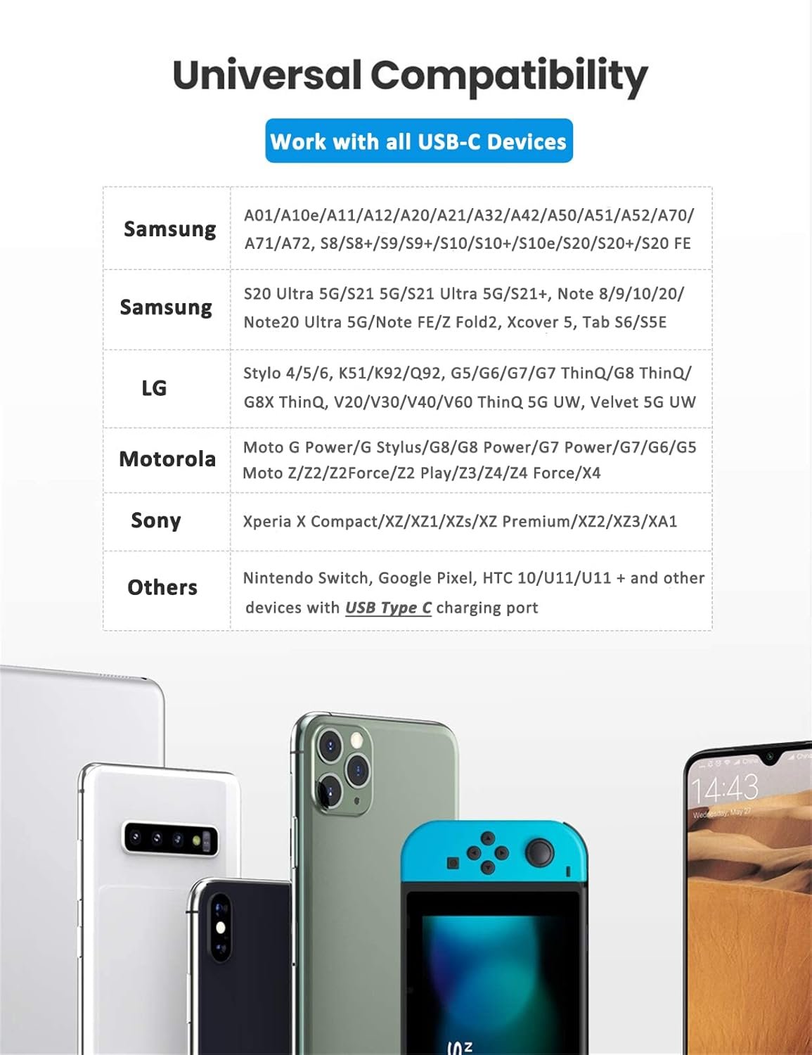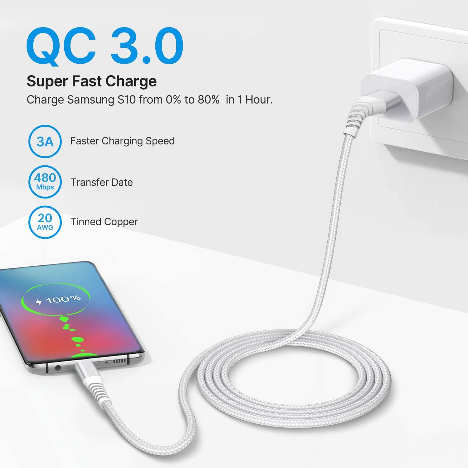 【Extra Durable C Cord Charger】 The reinforced SR design using TPE material can withstand 10,000+ Plug test and 10,000+ bending tests, which effectively protects this c phone charger cord from breaking. Premium nylon braided usb c charging cable adds additional durability and tangle free. Not afraid of being bitten by pets