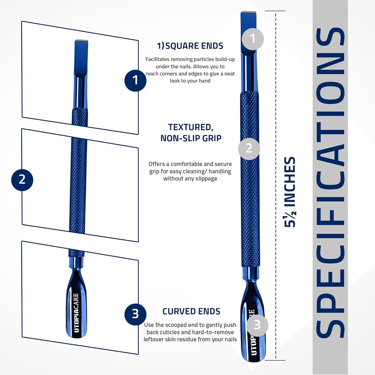 Specifications: The cuticle pusher measures 5½ inches with curved ends at one side while the knife-like ends at the other side help you reach a multitude of nooks and corners