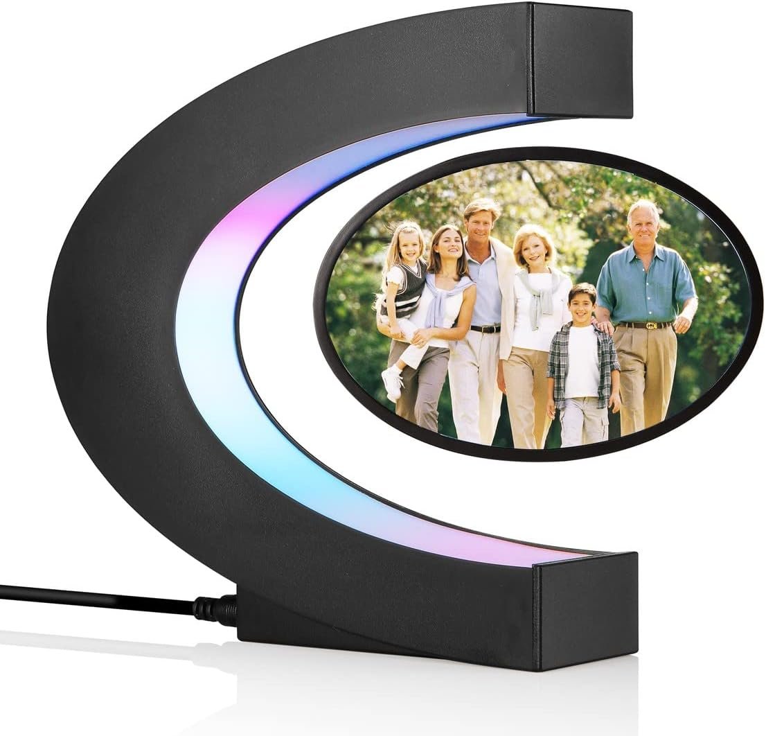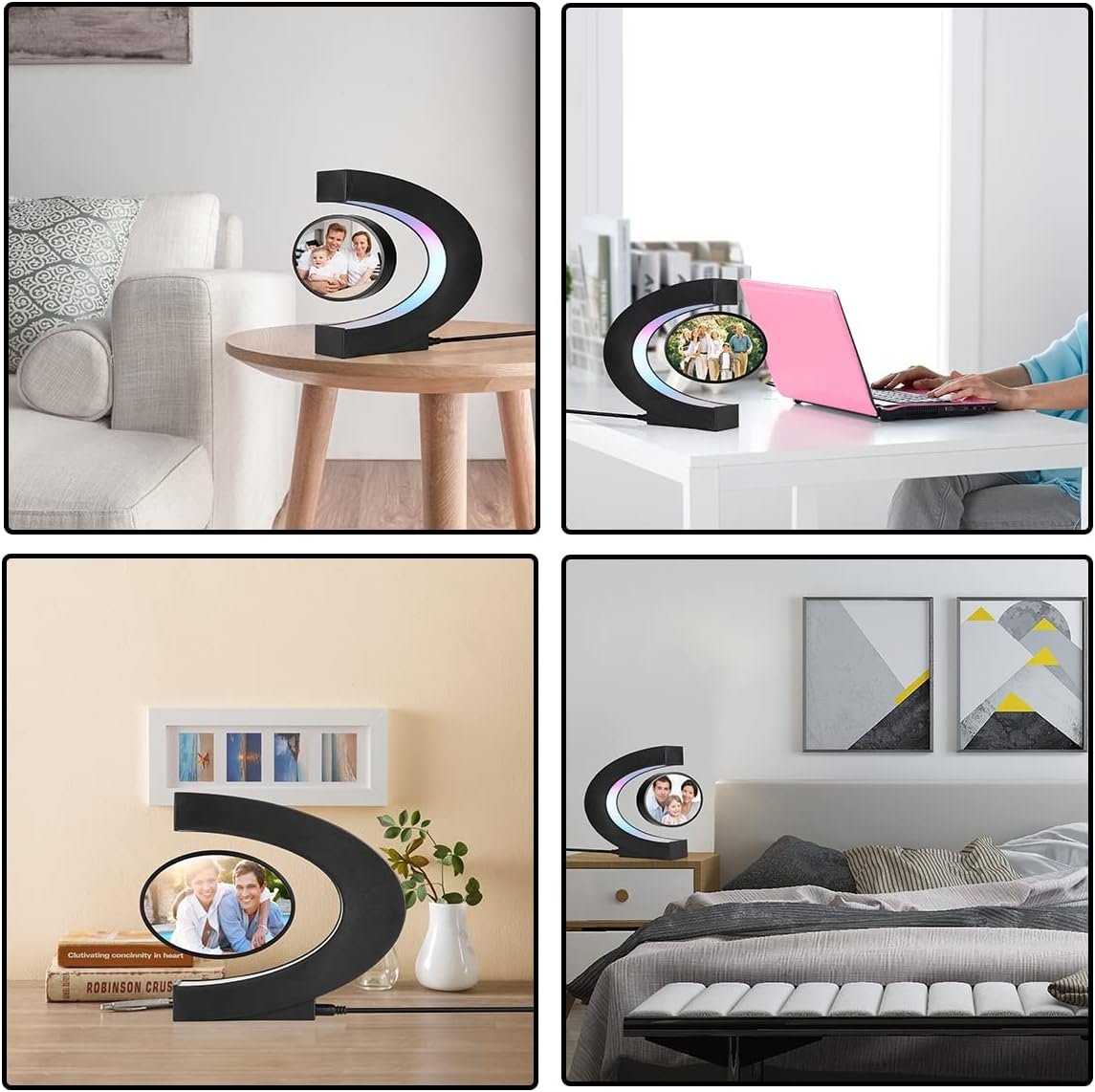 Magnetic Levitation Rotating Picture Frame: Magnetic levitation design, The photo frame floating in midair by the magnetic force from the bottom and top of the C shape base. Each time you give it a careful spin, It will 360 degree rotate smoothly for a while to show pictures on both sides, then stops. Silent work, No noise.