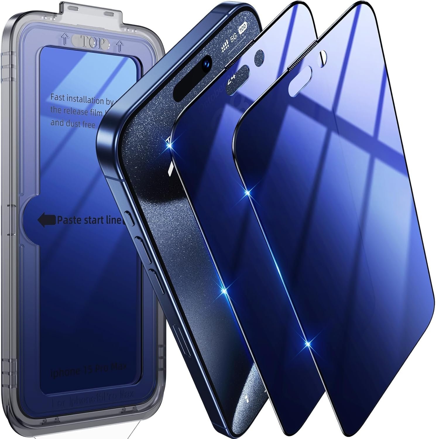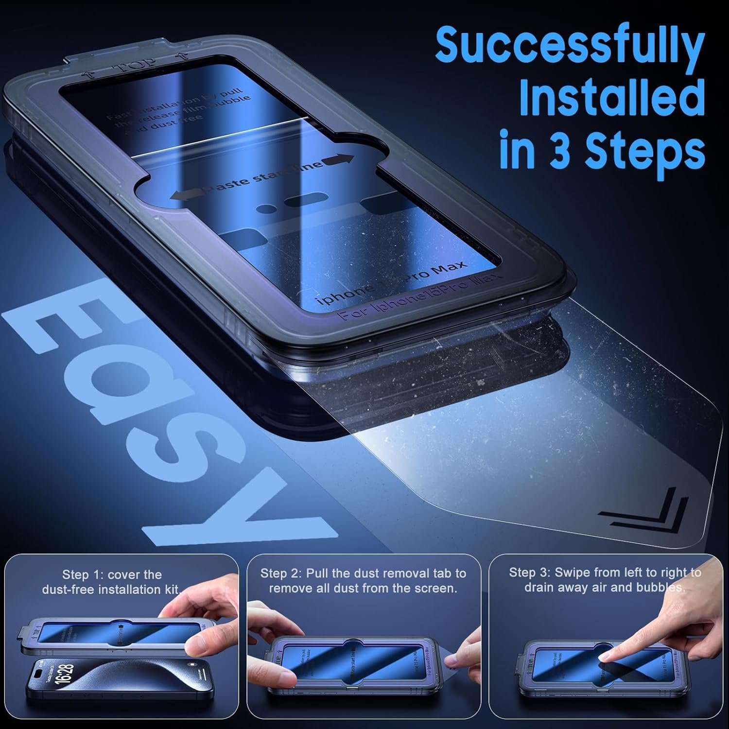 【Easy Fit Installation Tool & After-Sales Support】 No longer afraid of misaligning your phone screen, you just need to align the frame and install it on your iPhone 15 Pro Max, and it can be installed easily. Rest assured that your iPhone 15 Pro Max privacy screen protector comes with after-sales support, if you have any problem with our iPhone 15 Pro Max screen protector privacy glass during use time, for example: defective or installation problem, etc. Just contact us at any time, and we will come back to you within 12 hours.
