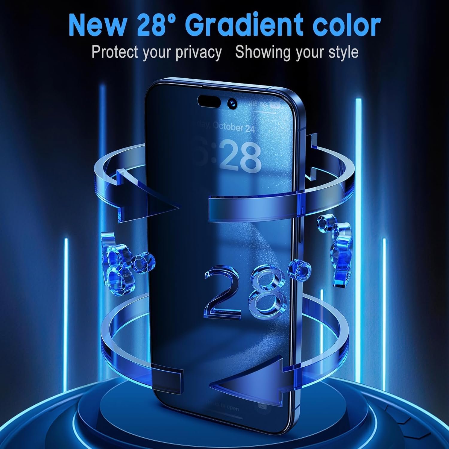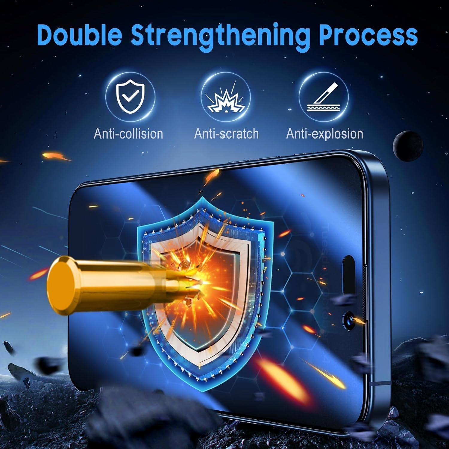 【Hardness Strengthened 5 Times】 With an aluminum content of up to 17%, our high-strength special glass material has greater toughness and strength than natural sapphire, with 9H+ hardness and our privacy screen iPhone 15 Pro Max retains crystal-like clarity. It can withstand over 80,000 bends and is subjected to 5 times end-strengthening processing, which improves its scratch resistance and impact resistance even further.