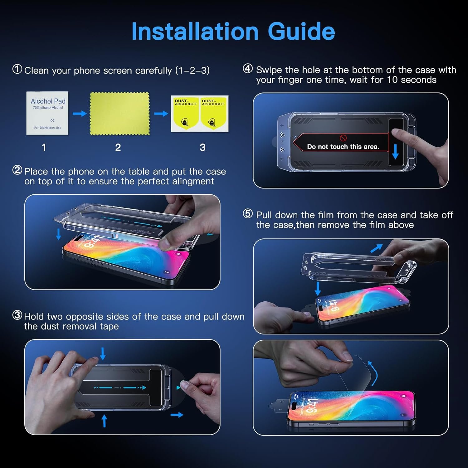 【Before Applying, Please Watch the Instructional Video】 Our screen protector 15 Pro Max features a high-molecular-weight silicone rubber adhesive that’s specially formulated for easy application and removal, ensuring no residue is left behind. Important: When swiping, only swiping the bottom edge; avoid touching the center to prevent bubble formation.