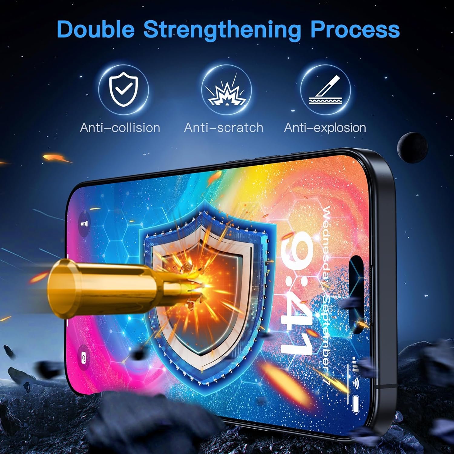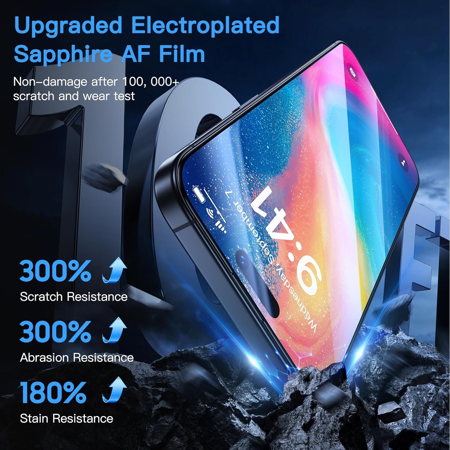 【Superior Strength, 5X Tougher】 Our special glass material, containing up to 17% aluminum, surpasses the strength and toughness of natural sapphire. The Uyiton 15 Pro Max screen protector undergoes a 5-step strengthening process, making it capable of withstanding over 80,000 bends. It’s highly resistant to scratches and impacts.