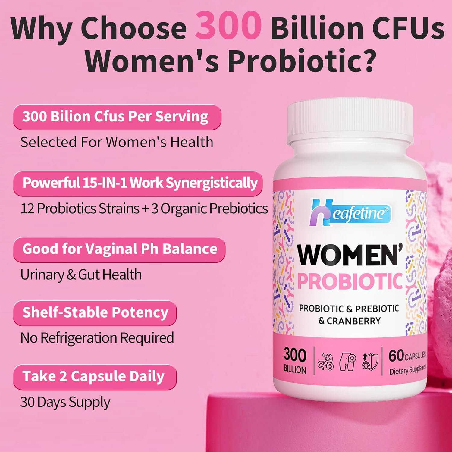 Vaginal Probiotics for Women, 300 Billion CFUs Probiotics for Women, 15-IN-1 Women’s Probiotic & Prebiotics, for Women’s Vaginal, Urinary Tract, PH Balance, Immune, Digestive, Bloating Health, 60 Caps