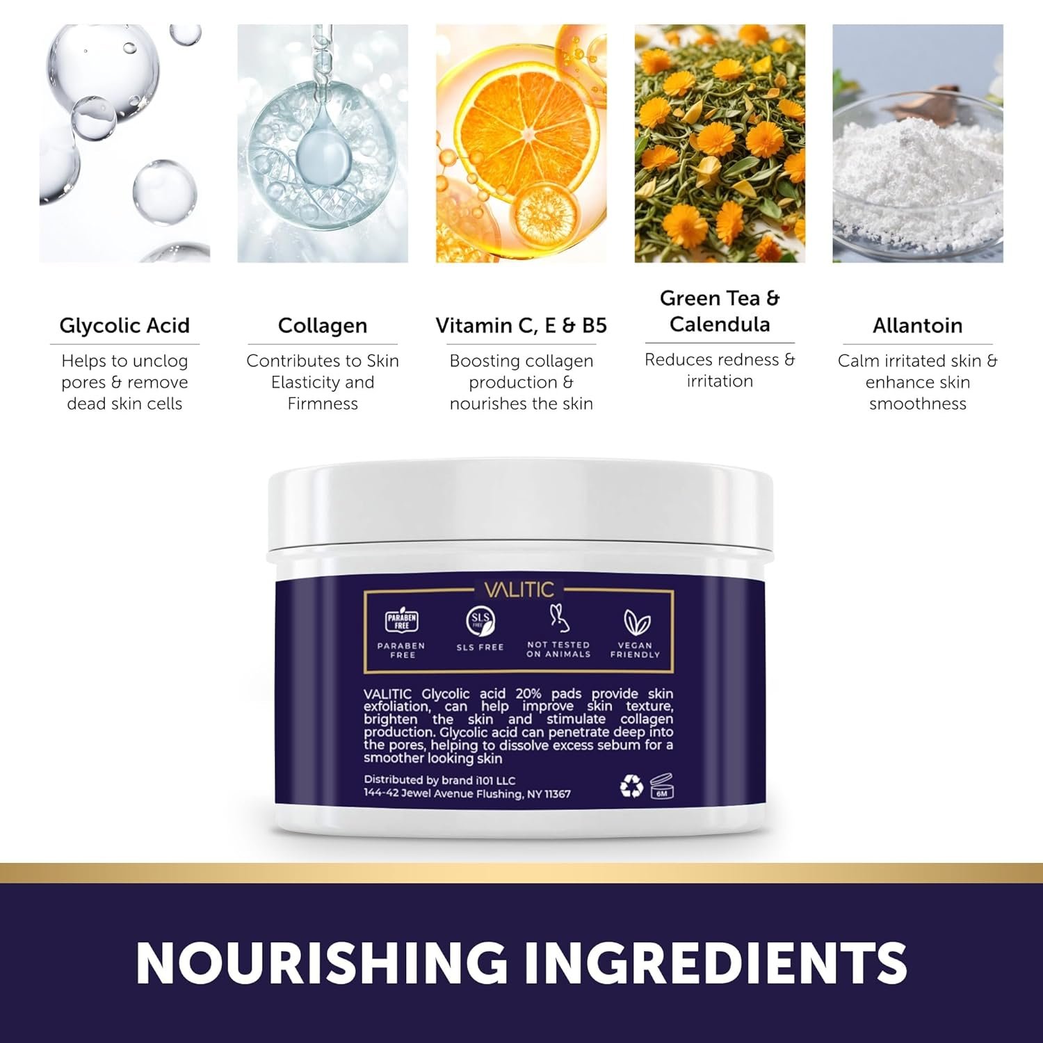 Allantoin, Green Tea and Calendula – These ingredients are incorporated into glycolic acid pads for their soothing and anti-inflammatory properties, reducing irritation and promoting better complexion
