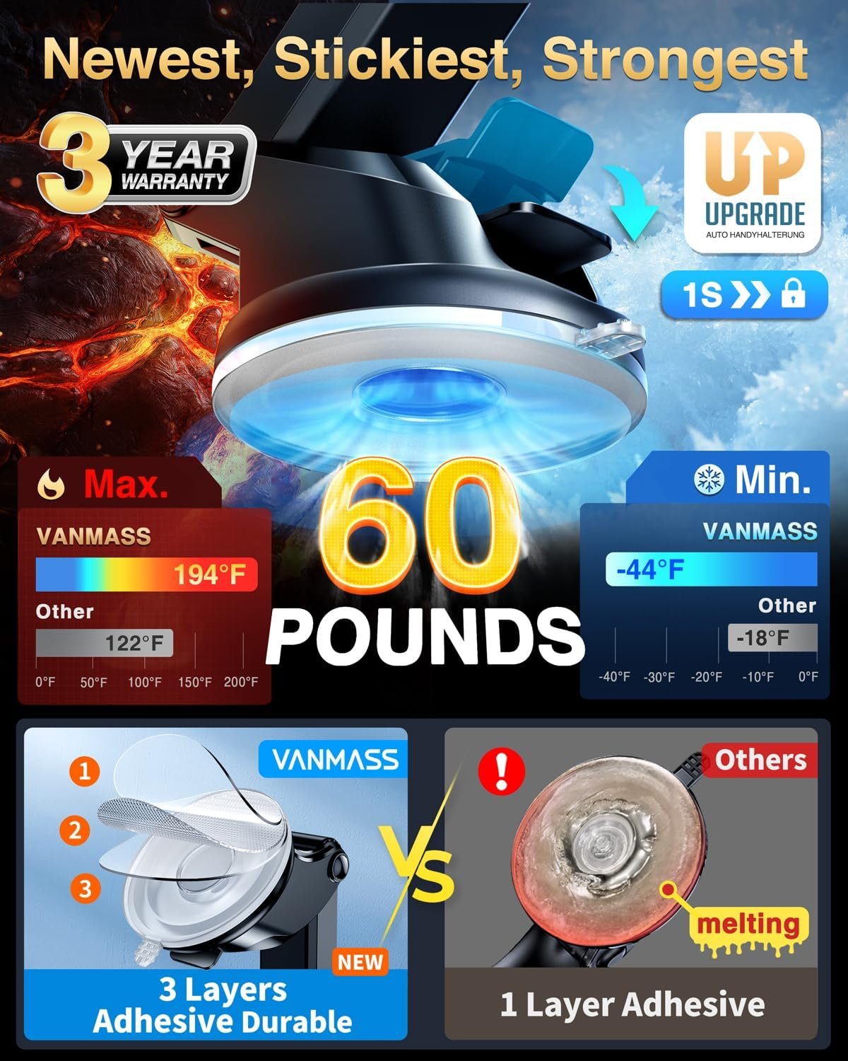【VANMASS Max Upgraded Newest Model, Strongest Suction】Absolutely 60+LBS suction cup!! Design core: Don’t enlarge the suction cup diameter (avoid taking up too much area of dashboard/windshield to cause vision obstruction); this model has upgraded the suction cup forging technology: applied pure PU with epoxy resin adhesive synthetic exclusive technology to improve its suction power to 60+ pounds; 50% stronger, 50X other models, UV resistance, never melt, NO dashboard pad needed, NO marks left