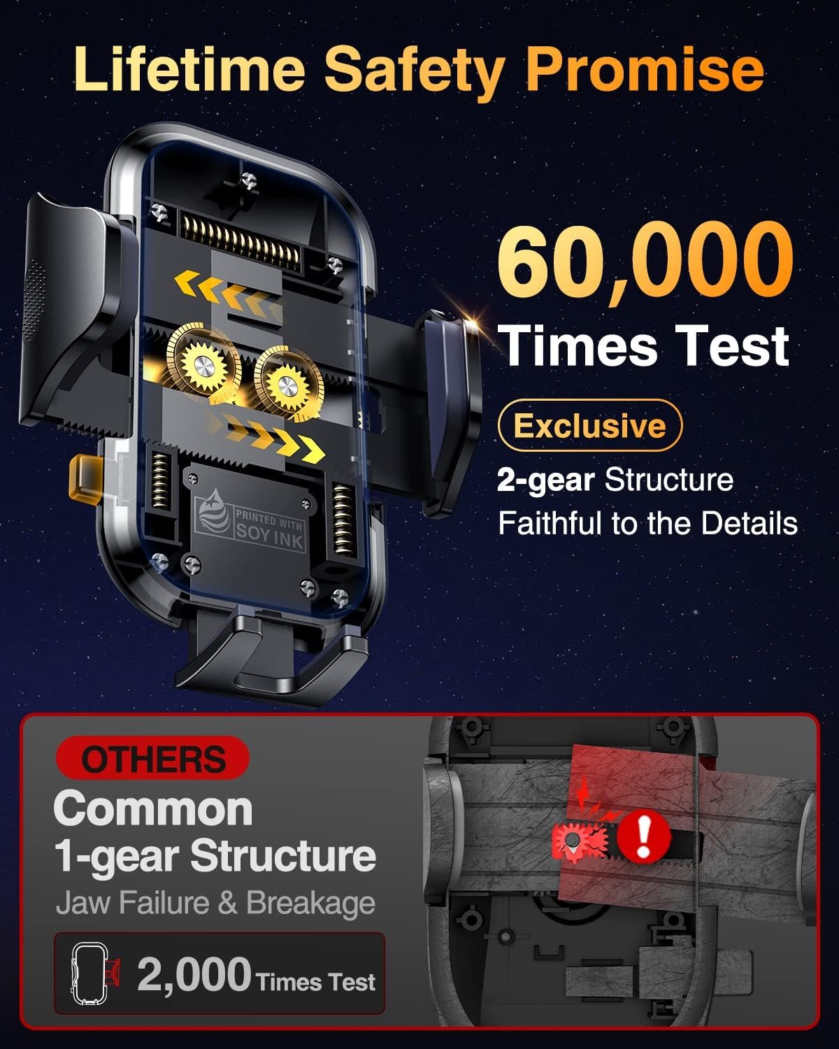 【2024 Best Military-Grade Phone Holder】VANMASS’s best mount with the highest rating! Preferred by 10,000,000+ Customers; Designed by world-class professional team; enjoy EUIPO Patent (No.007708805-0001), Military-grade certificate (No. GZMR220601855501), CP65/REACH/ROHS; It born based on studied 500+ holders & 500+ suction cups & 4,000+ materials; Exclusive 2 engaged gears clamp arms, 5,000+ open/close test; 10,000+ vibration resistance; 20,000+ miles road tests; -40℉-194℉ laboratory test