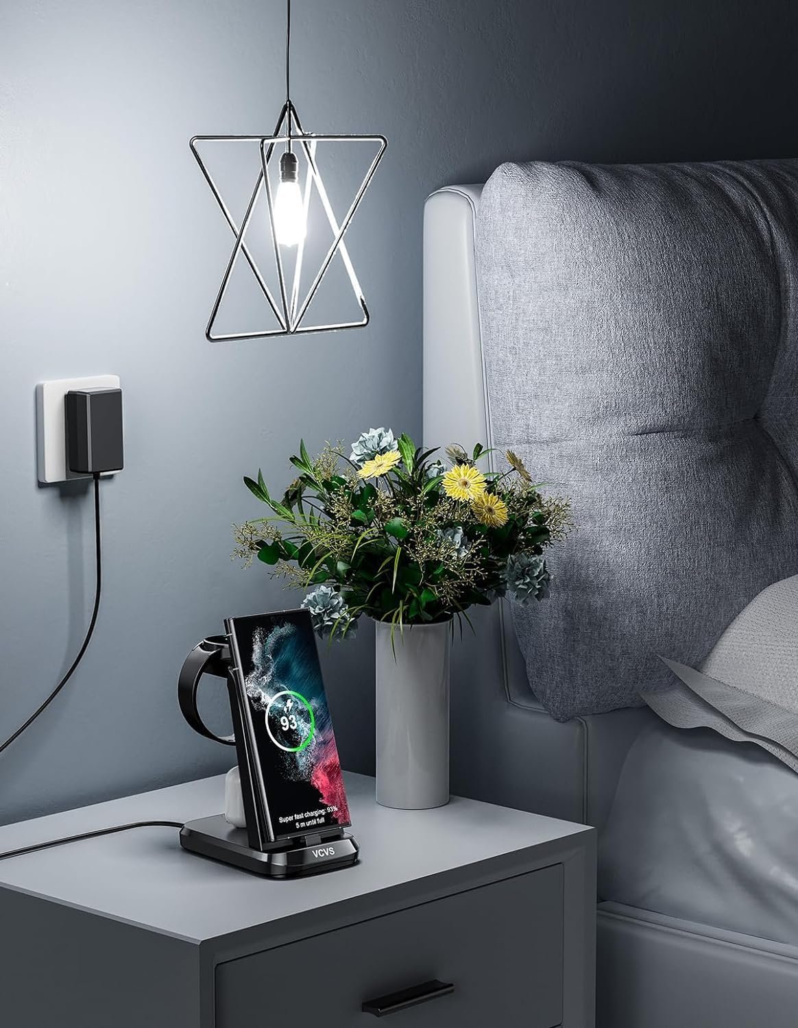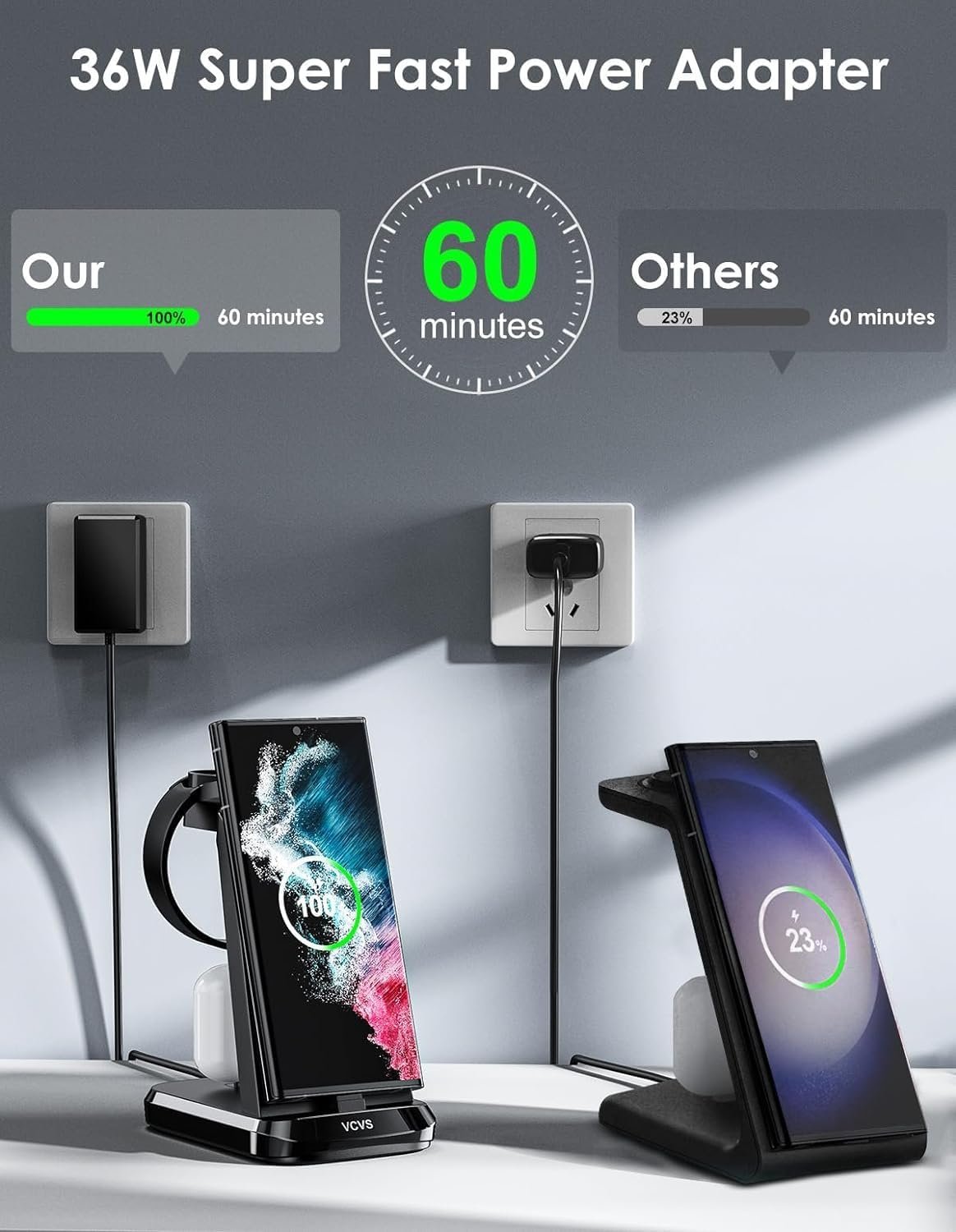 【36W Super Fast Charger for Samsung】This super fast charging station is equipped with the latest advanced smart and efficient chipset, and the 2023 new version is upgraded faster than the old one. The input of the charging station up to 36W, which means that it takes only 1 hour to full charged your device, up to 2-3 times faster than a standard wireless charger.