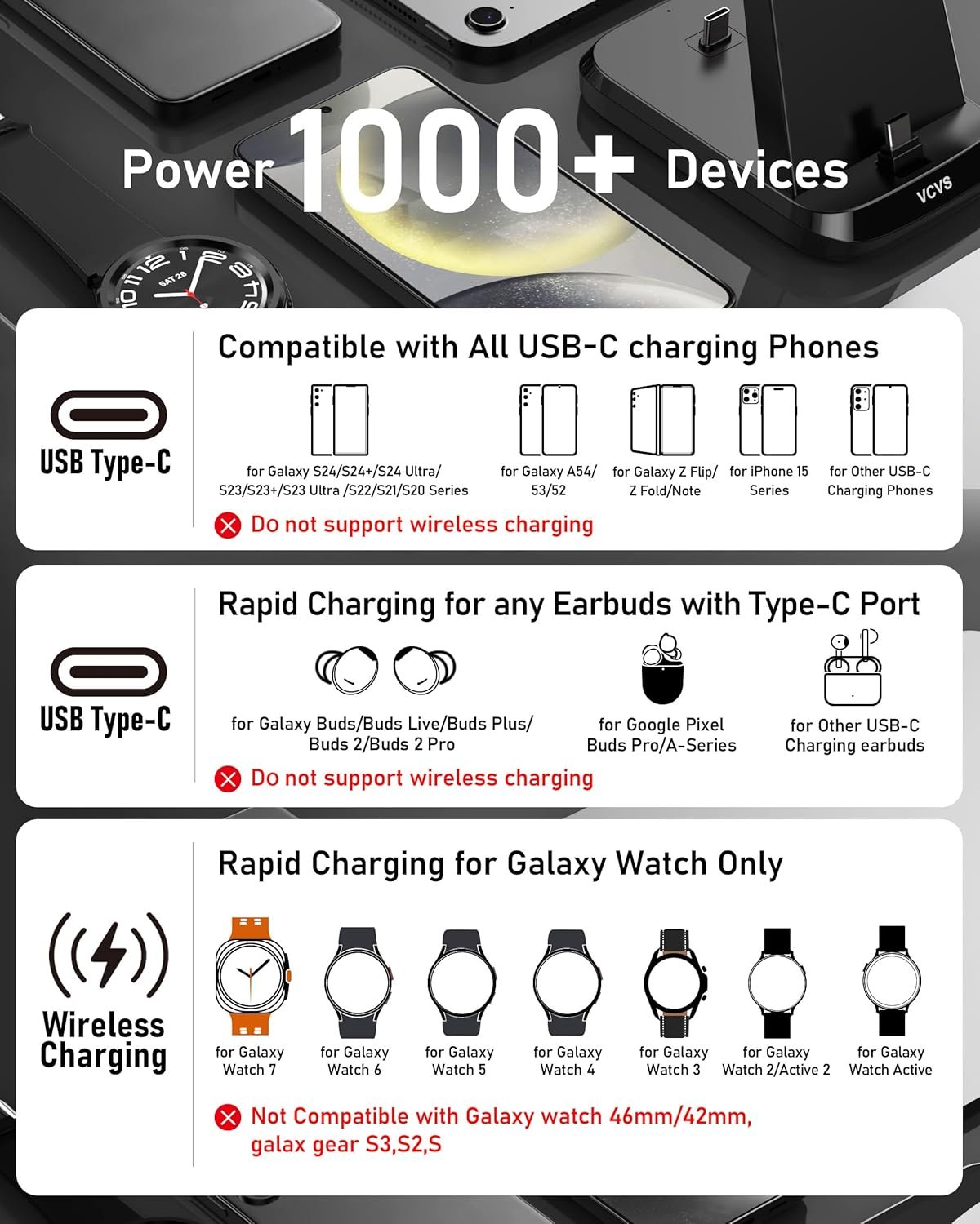 【More Universal Compatibility】The front USB-C port is compatible with Samsung phone, Iphone 15/Pro/Max and any other USB-C phones; The rear USB-C charging port is for Samsung Galaxy Buds series and any other USB-C earbuds; The top wireless charging dock is only compatible with Samsung Galaxy Watch Ultra, 7, 6, 6 classic, 5, 5 Pro, 4, 4 Classic, 3, Active 2, Active 1. (Note: Not compatible with Apple watch and other watch)