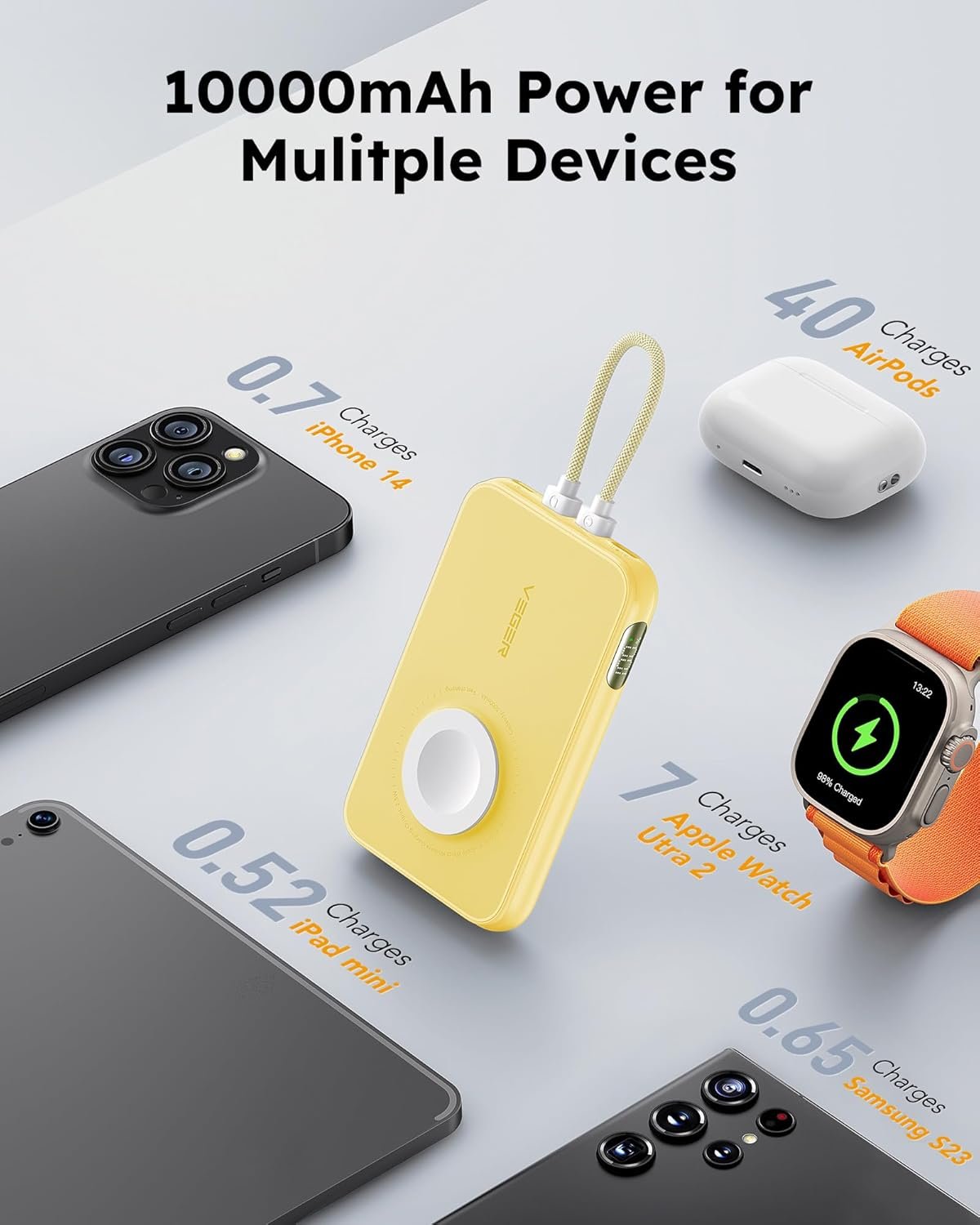 ✔️【10000mAh Battery with Slim Body】: With a slim size of 4*2.4*0.6 inches, the external battery is a perfect travel accessory. 10000mAh capacity is emergenced for daily used, providing 1.8 charges for iPhone 14, 15 charges for Apple Watch Ultra, 0.85Charges for iPad mini 6, 55 charges for Airpods, 1.6 charges for Samsung S23.