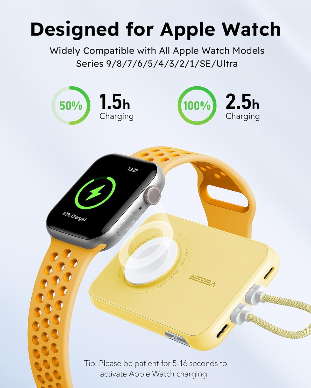 ✔️【Friendly Reminder】When charging your Apple Watch, kindly press the button and wait 5-16 seconds for the wireless charging to activate.