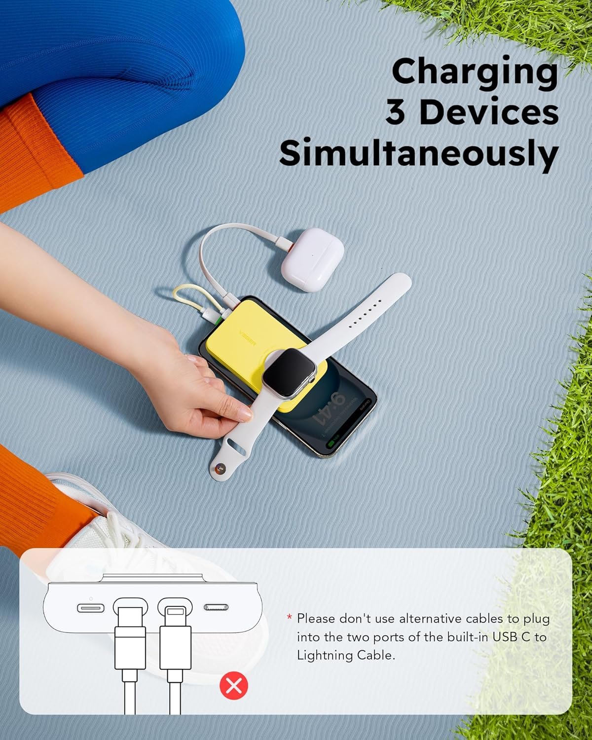 ✔️【Portable Charger with built in Cable for iPhone】: The portable charger is built in a bidirectional USB C to IOS cable, which is fit with iPhone 15, a magnetic module is designed specifically for Apple Watch. Powering your iPhone, Apple Watch, and AirPods simultaneously, this portable charger could meet the charging needs of the entire Apple family.[Note: Please be aware that the ports where our built-in cables are located are specifically designed for our cables.
