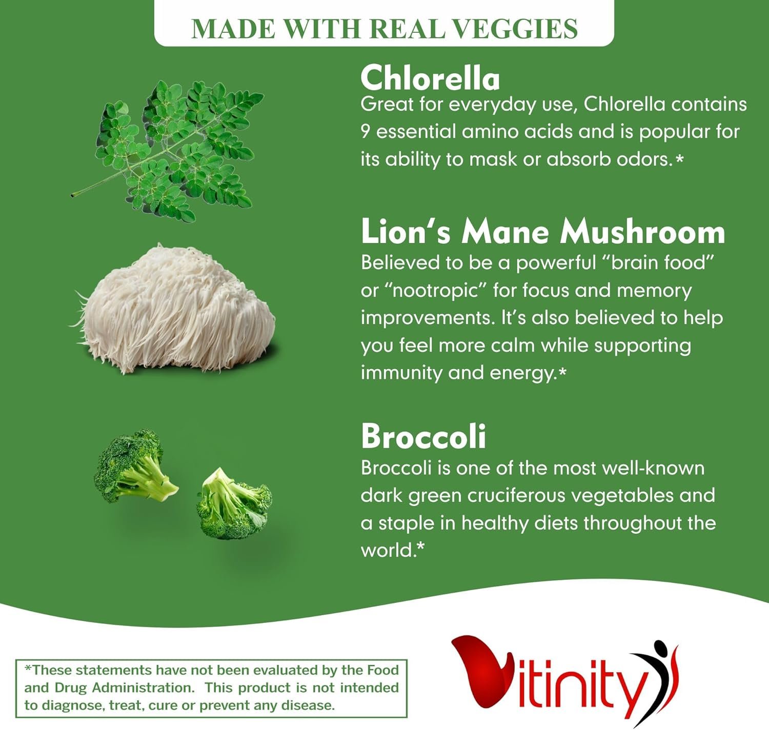 [Healthy Veggies] Delicious Natural Flavors with Pectin-Based Gummies.Vitinity Veggie supplement gummies contain whole food:Chlorella, Spinach, Spirulina, Broccoli, Brussel Sprout, Turmeric, Milk Thistle, Celery, Nettle, Echinacea, Elderberry, Moringa, Astragalus, Lion’s Mane, Reishi, Ashwagandha, Beet Root, Green Tea, Ginger, Cinnamon bark, Bamboo Leaf, Thyme.