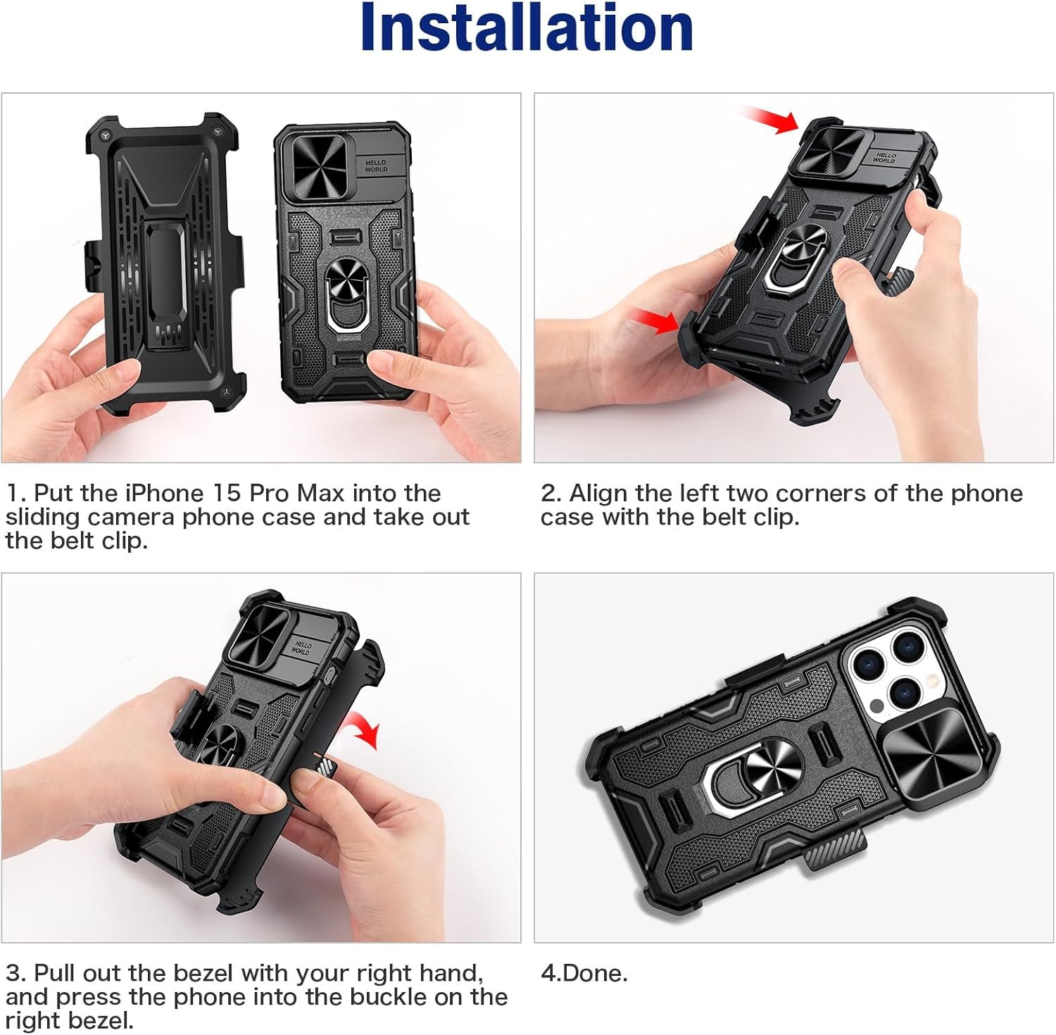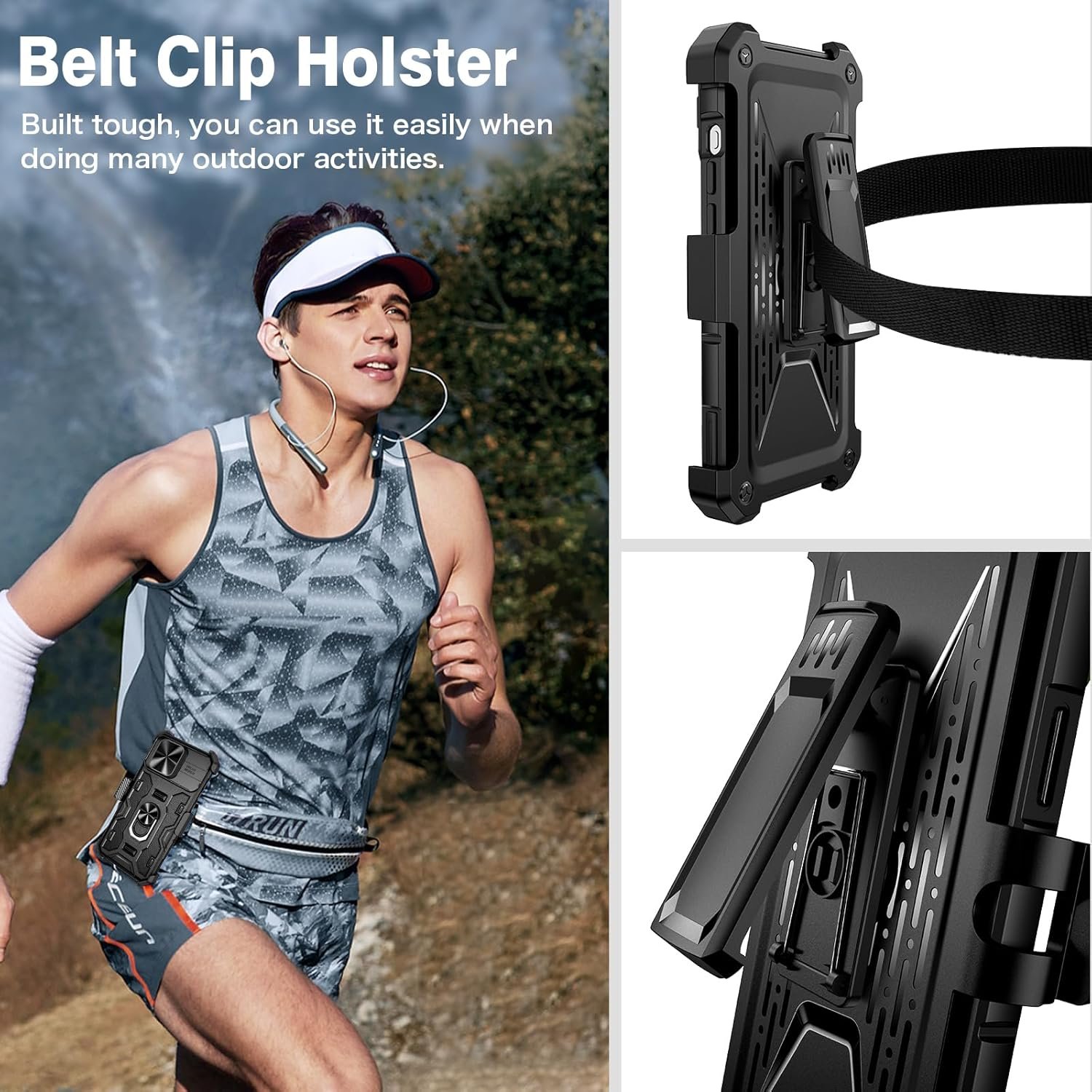 Belt Clip Holster: The case with rugged holster belt clip for iPhone 15 Pro Max. The belt clip can also be rotated 360 degrees to use as a durable kickstand.
