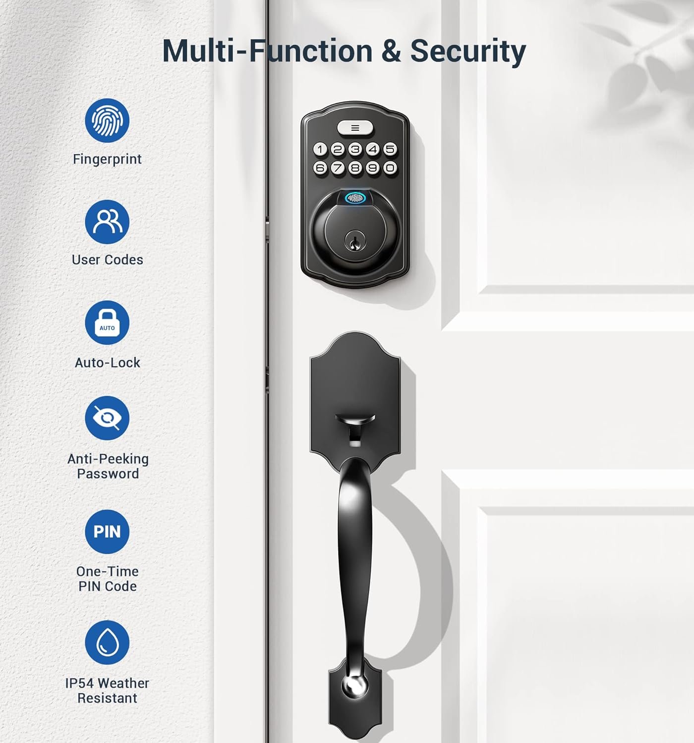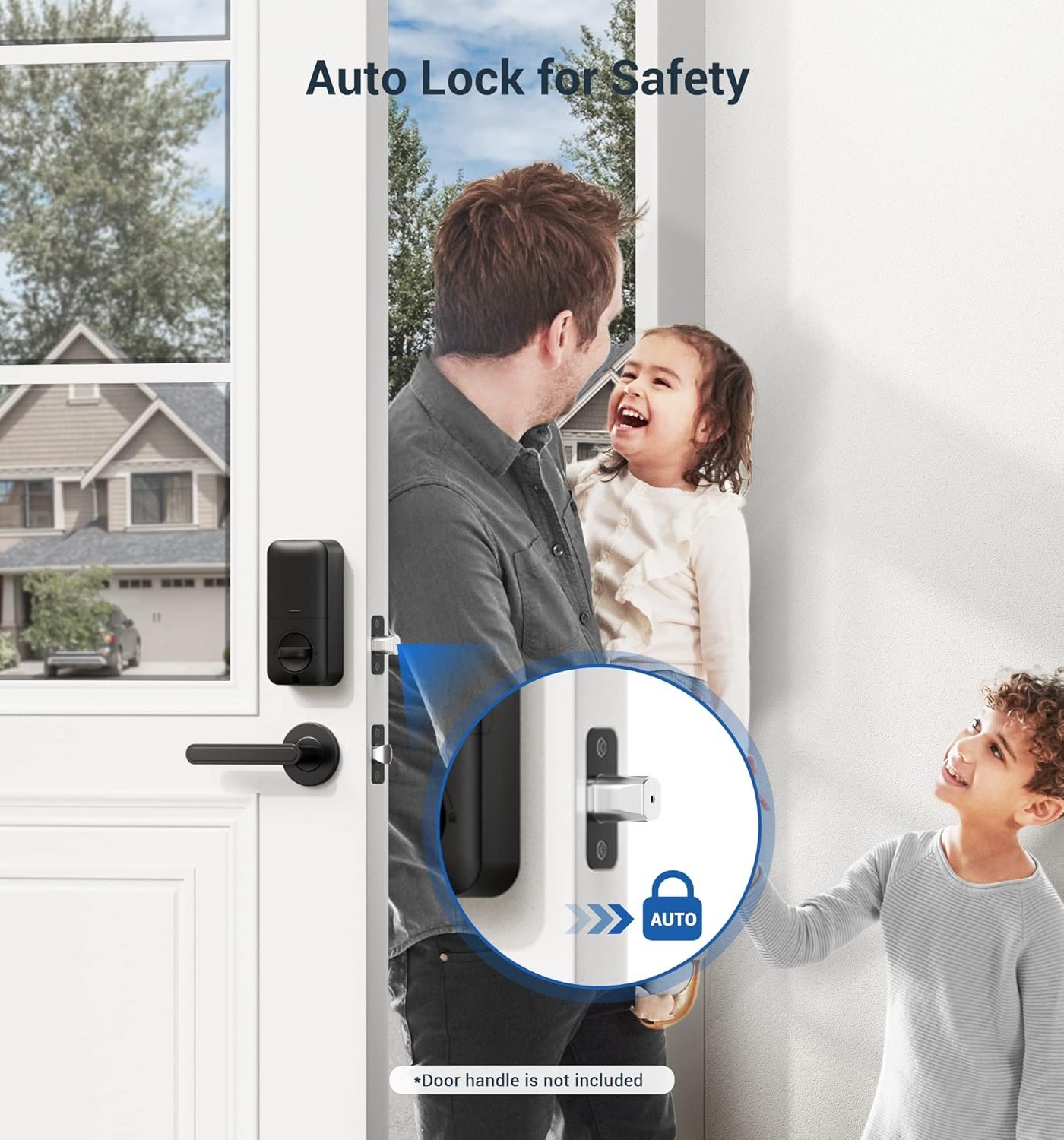 Security Locking: “Smart Door Locking” – The door lock auto-locks in 10-99 seconds. Press and hold any key for 2 seconds to activate “One-touch Lock.” The rotatable knob allows for locking/unlocking in 1 second from the inside
