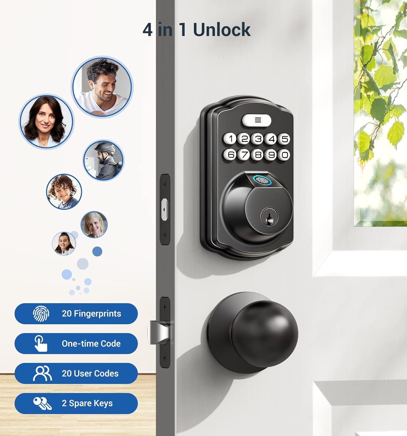 [4-in-1] Unlock: 20 fingerprints, 20 passwords, 2 spare keys for family use, and one-time passwords for temporary visitors. The one-time passwords will be automatically deleted after use