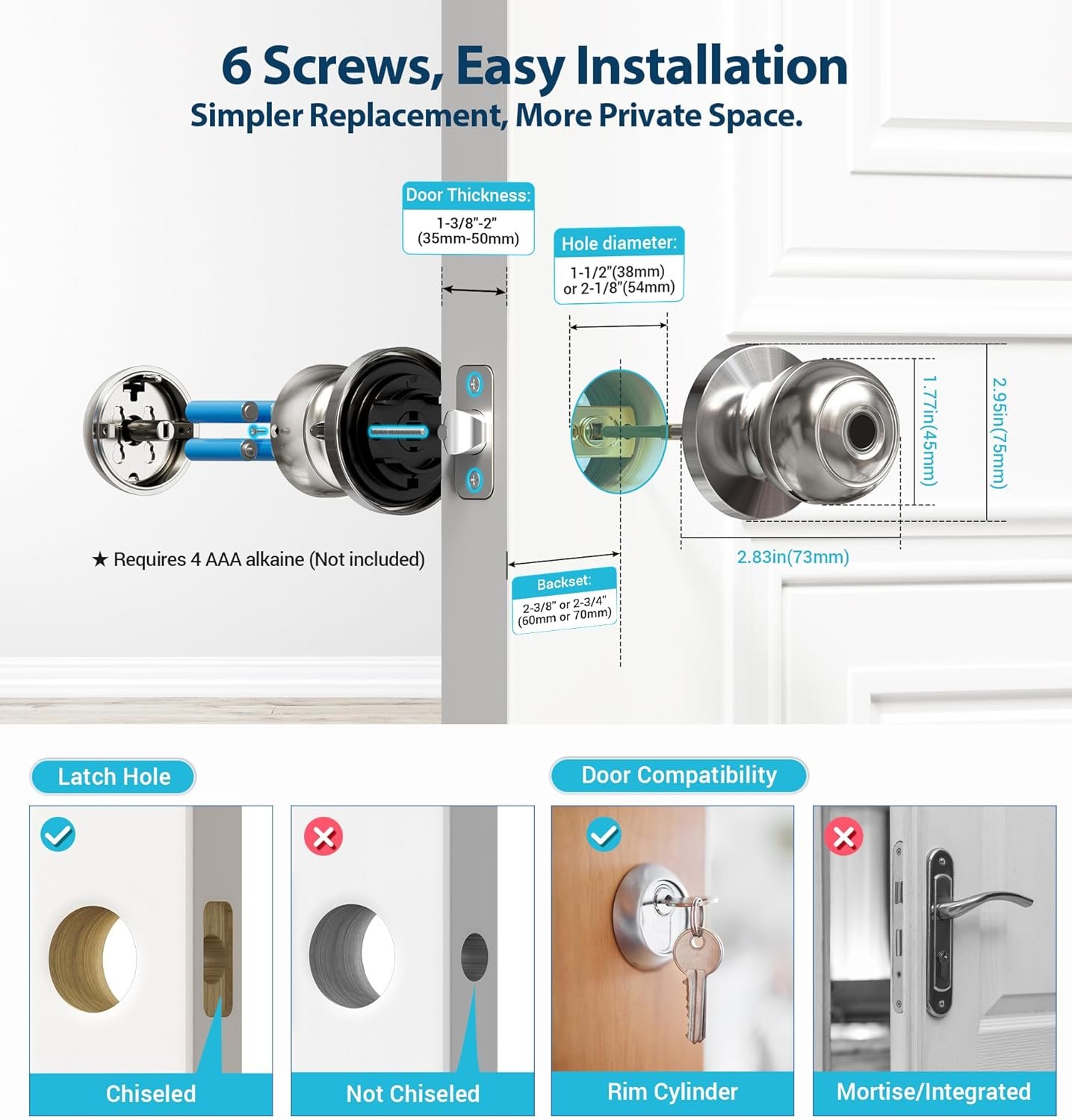 Easy Installation: Installation requires four AAA alkaine batteries (Not included). Just install knob with a screwdriver within minutes to own your personal space. Plus, from the day of purchase, enjoy lifelong online phone and email support