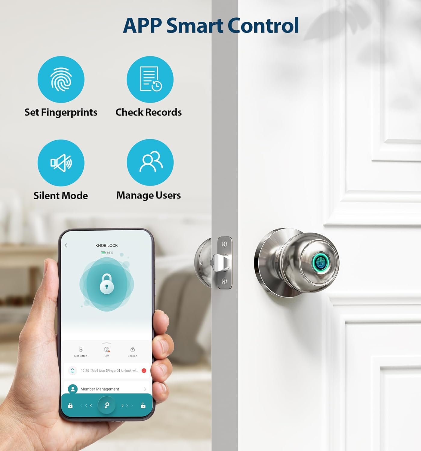 Smart APP Control: Our thumbprint door knob offers convenient control via the smart life app, allowing you to set fingerprints, manage users, check access records, and activate silent mode effortlessly with just a few taps on your smartphone