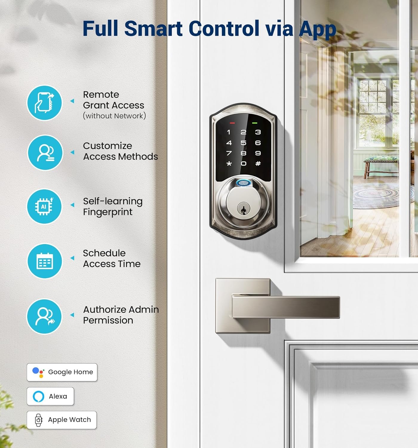 Total Control: Veise Smart Lock grants access management via fingerprint, password, fobs, keys, Apple Watch, and voice control (Requires Veise G2 Gateway)