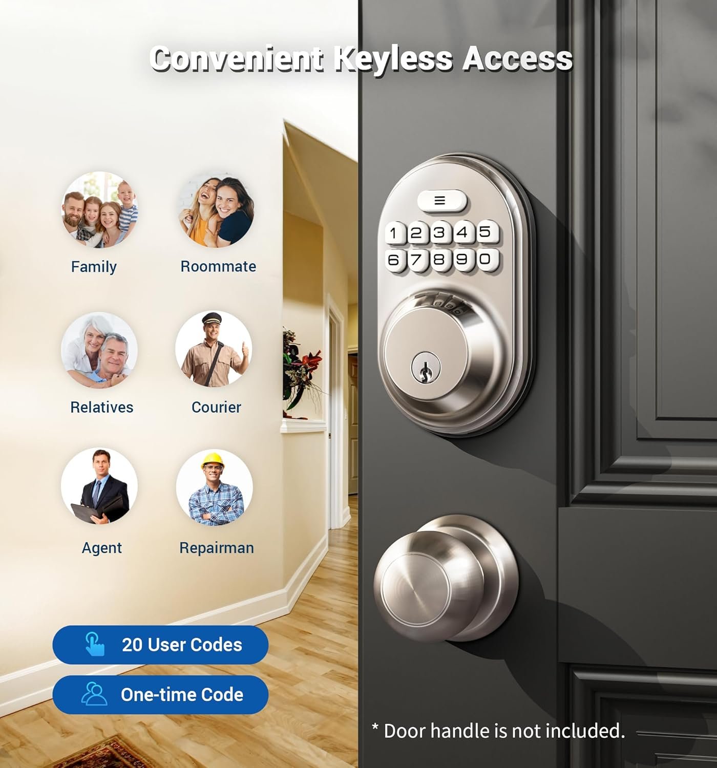 Electronic Door Lock: Has backlit keypad and low battery alert, mute mode and vacation mode, water resistant, go perfectly with both traditional and modern house