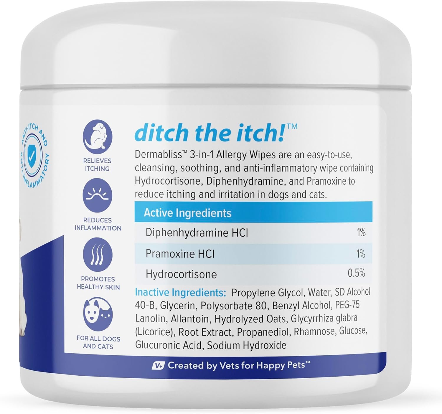 Vetnique Dermabliss 3-in-1 Medicated Dog Wipes – Relief for Itchy Skin, Allergies & Odor Control, Gentle No-Sting Formula, Antihistamine & Hydrocortisone Paw Wipes for Dogs & Cats 50ct