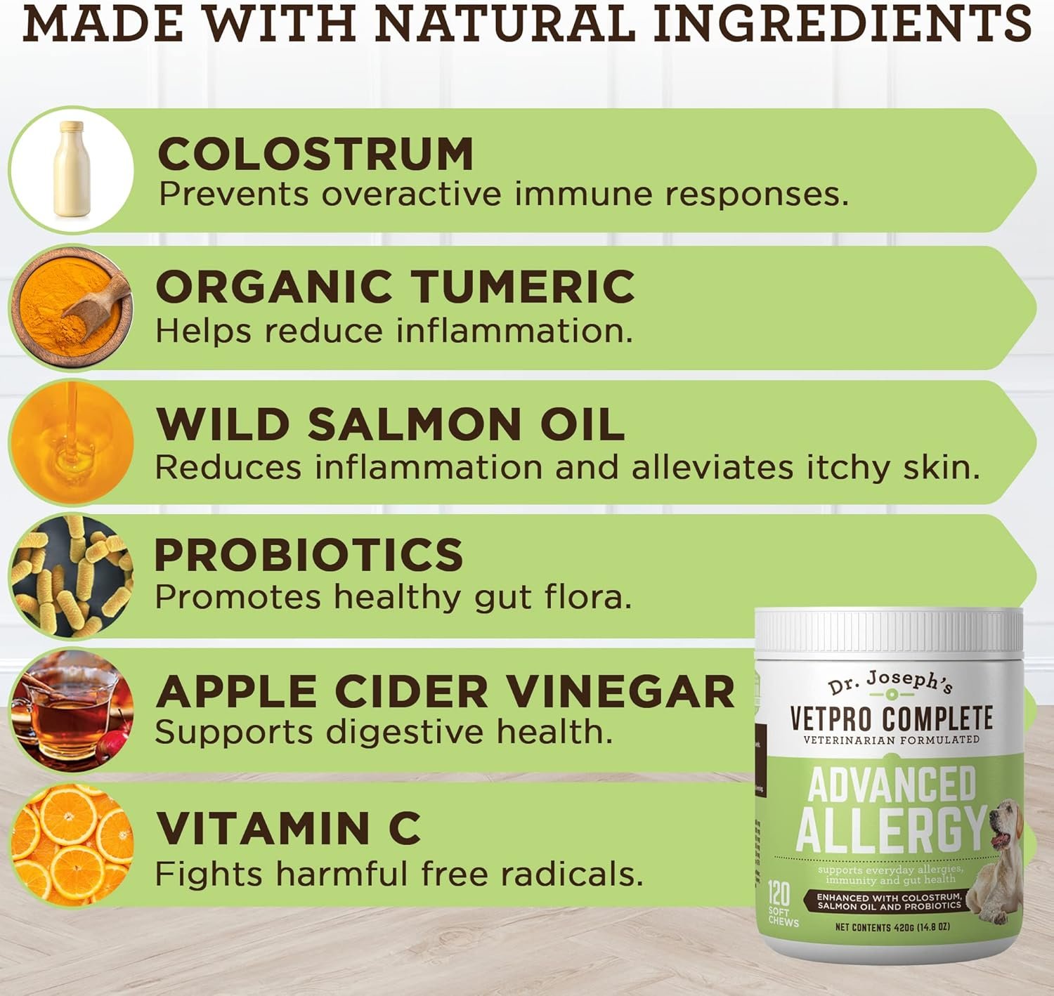 Allergy Relief for Dogs – Dog shampoo for allergies and itching only bring temporary, external relief, but VetPro’s Dog Allergy Chews treat your dog internally for real results. Our effective dog allergy medicine supports a normal histamine response for skin, seasonal, and environmental allergy issues. We infuse our dog itch relief supplement with Apple Cider Vinegar which helps balance the pH of the skin, and resolves skin infections.