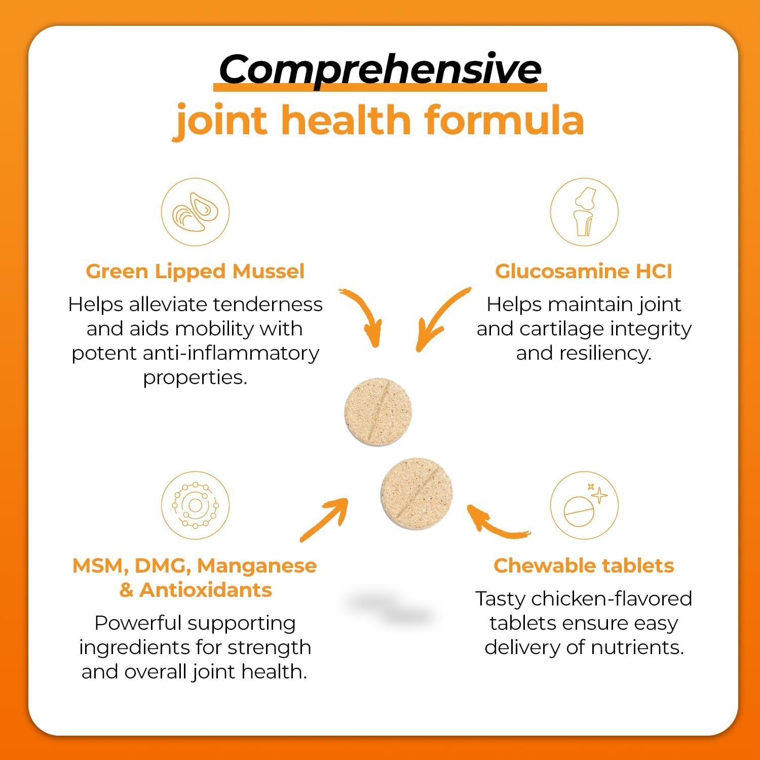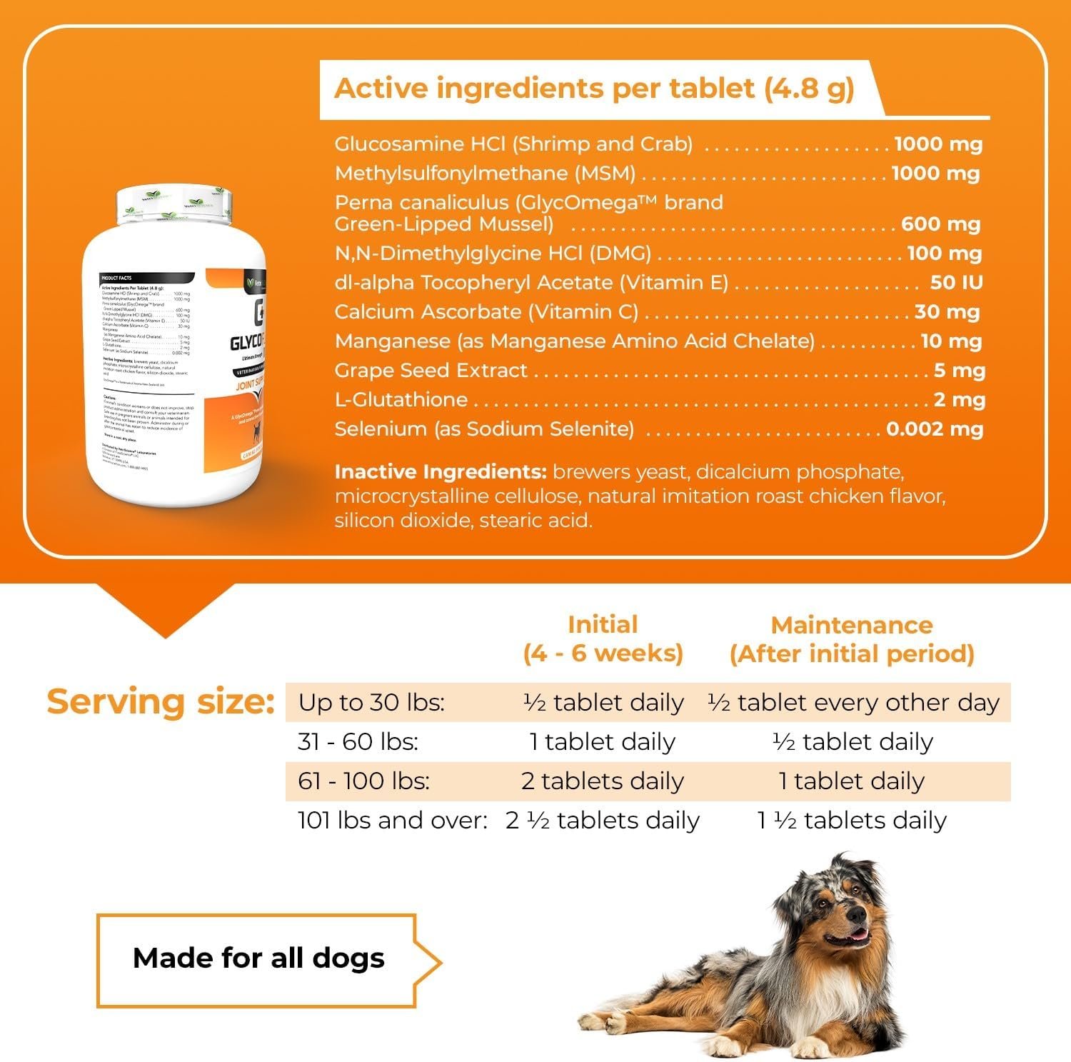 Active Ingredients Per Tablet: Glucosamine HCl (Shrimp and Crab), 1000 mg; Methylsulfonylmethane (MSM), 1000 mg; Perna Canaliculus (GlycOmega brand Green Lipped Mussel), 600 mg; N,N-Dimethylglycine HCl (DMG), 100 mg; dl-alpha Tocopheryl Acetate (Vitamin E), 50 IU; Calcium Ascorbate (Vitamin C), 30 mg; Manganese (as Manganese Amino Acid Chelate), 10 mg; Grape Seed Extract, 5 mg; L-Glutathione, 2 mg; Selenium (as Sodium Selenite), 0.002 mg. Inactive Ingredients: brewers yeast, cellulose, dicalcium phosphate, natural imitation roast chicken flavor, silicon dioxide, stearic acid. GlycOmega is a trademark of Aroma New Zealand Ltd.