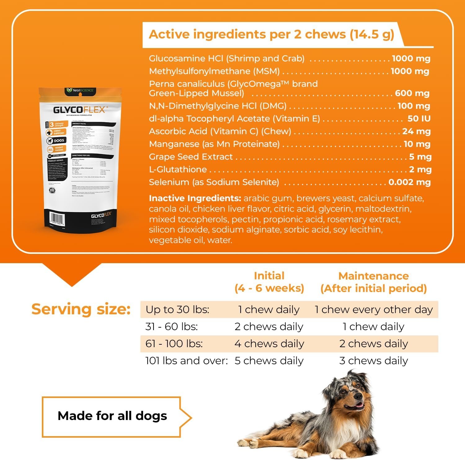 Maximum strength joint health formula: Our GlycoFlex 3 canine formula combines 10 active ingredients including green lipped mussel, glucosamine for dogs, MSM, DMG, and antioxidants to help improve joint integrity, strength, mobility and function