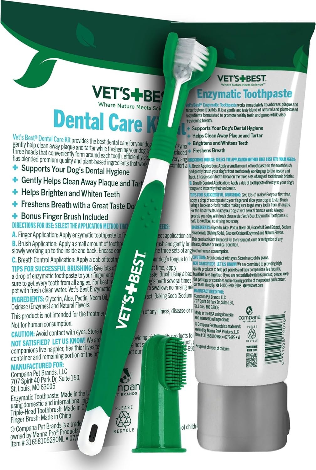 Provide the best dental care for your dog with Vet’s Best Complete Enzymatic Dental Care Gel & Toothbrush Kit. Our veterinarian-formulated toothpaste contains enzymes and natural ingredients (including neem oil, grapefruit seed extract, baking soda, and aloe) that gently clean away plaque and tartar while freshening your dog’s breath. The kit includes our triple-headed toothbrush, which makes brushing quick and convenient. Three bristle heads are positioned to form around each tooth, efficiently cleaning from every angle simultaneously.