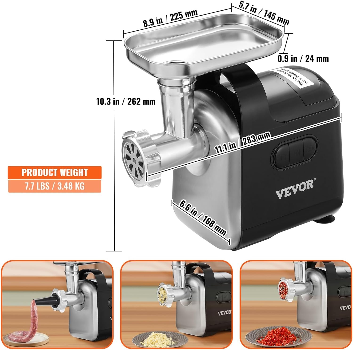 The 550W motor is used for high-speed meat mincing, which can reach 6.6 pounds per minute and can work continuously for 15 minutes.