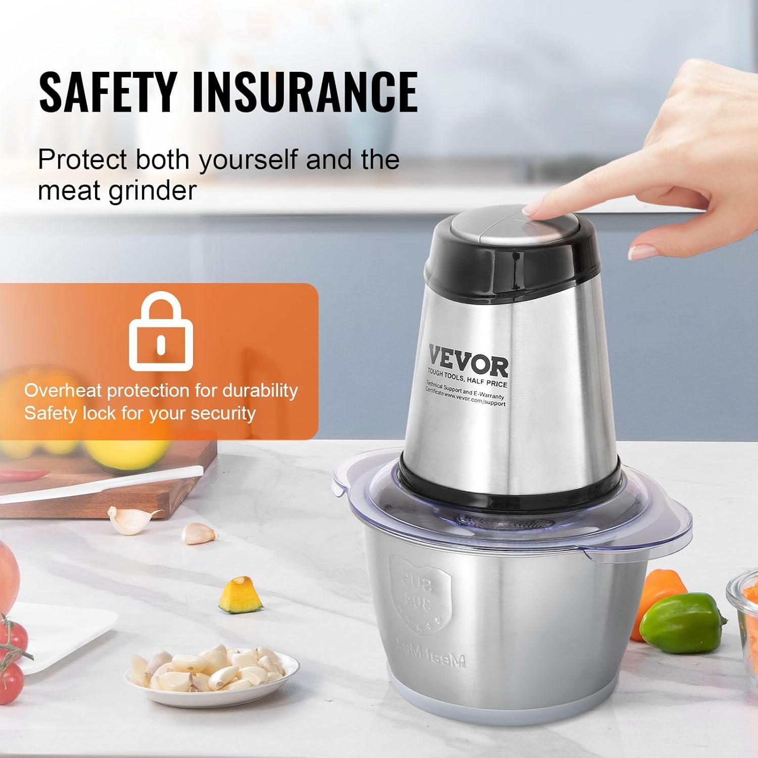 Safety and Stability: The safety switch ensures the blade activates only when the food processor is correctly locked. Worried about overheating? Our electric meat grinder’s built-in overheating protection ensures safety by automatically cutting off power in case of excessive heat. And a non-slip rubber ring keeps the electric food chopper securely in place, minimizing the risk of accidents.