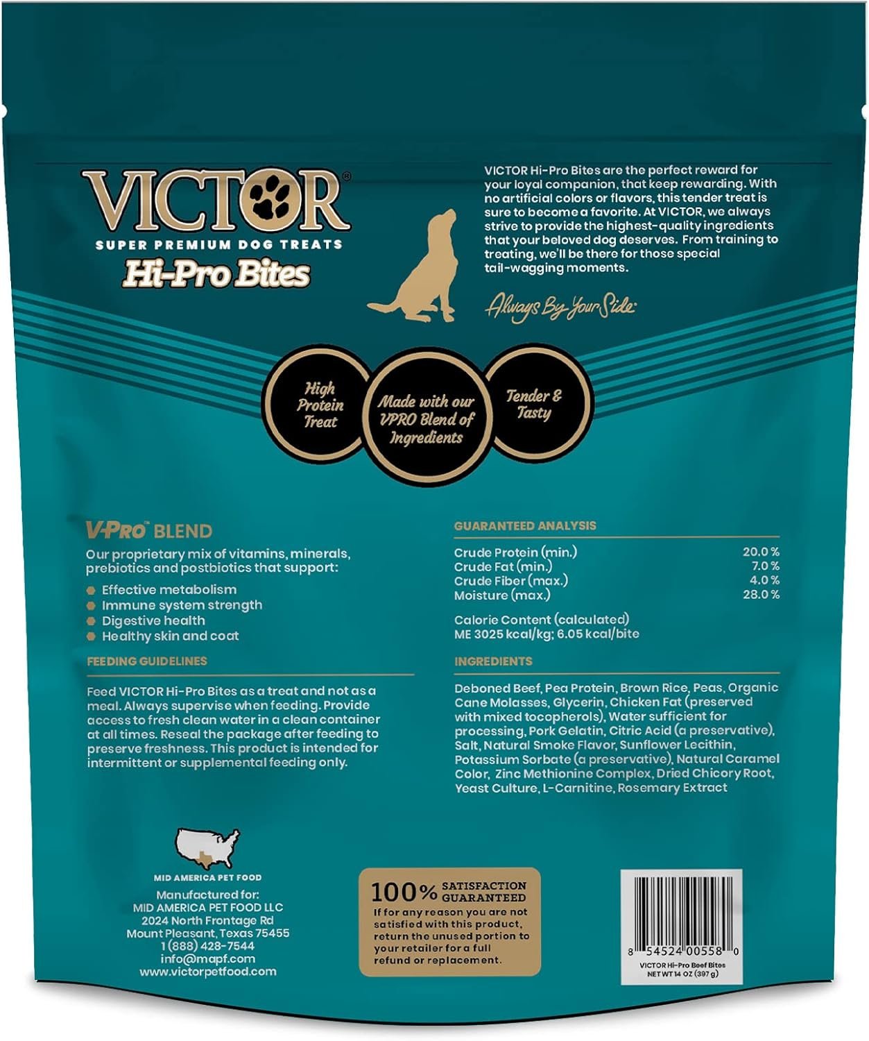 CLASSIC HI-PRO BITES DOG TREATS: Let VICTOR be there for those special tail-wagging moments. Perfect for treating and training dogs of all breed sizes and all life stages, these tender real beef Hi-Pro Bites are an ideal reward for your loyal companion. Featuring real beef as the first ingredient, our Hi-Pro Bites are low in calories, making them an ideal training treat for dogs of all breed sizes and all life stages. These high protein dog treats feature our VPRO Blend of nutrients, expertly developed to support effective metabolism, immune system strength, digestive health and healthy skin and coat. These dog treats contain no artificial colors or flavors and are free from corn, soy or wheat. These adult and puppy treats are 20% protein and 7% fat, and 3025 KCAL/KG or 6.05 KCAL/BITE.