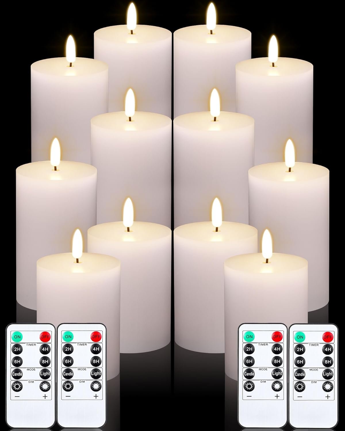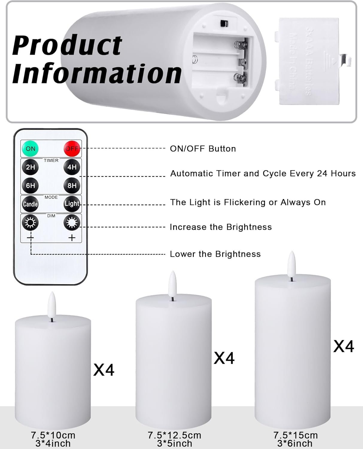 Package Includes: you will receive a total of 12 pieces of white flameless candles with 4 pieces of remote controls; The candles measure about 3 inches in diameter, and they have 3 different heights, 4 pieces of 4″ tall LED candles, 4 pieces of 5″ tall LED candles, and 4 pieces of 6″ tall LED candles