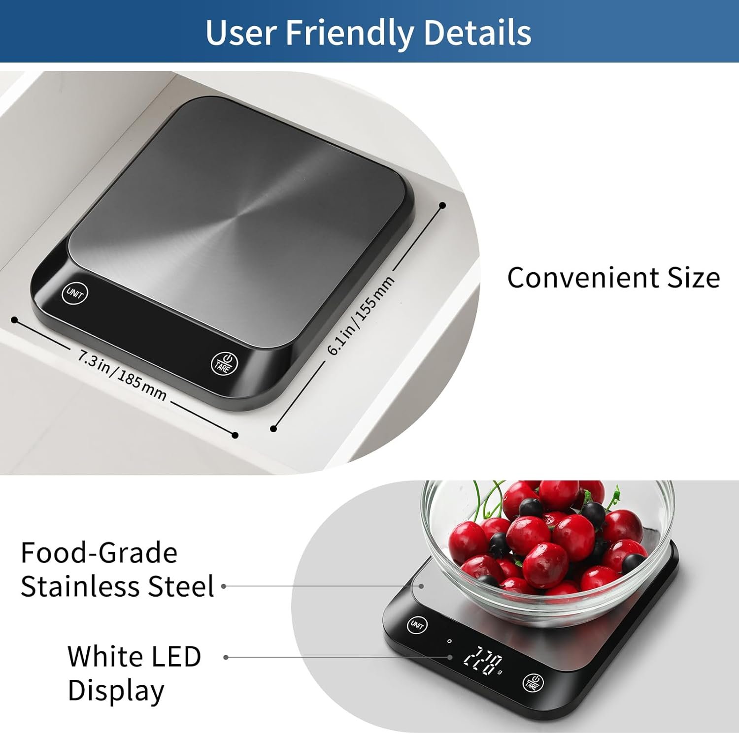 EASY TO USE – The food scale utilized up-to-date digital technology, along with many friendly features including: First of all, it is equipped with 4 high precision load cells for guaranteeing high accuracy at every measurement; Secondly, the delicate food-grade stainless steel weighing platform for easily cooking, baking and cleaning; Thirdly, Tare function (Add & Weigh): allows for weighing multiple ingredients in the same container without moving.