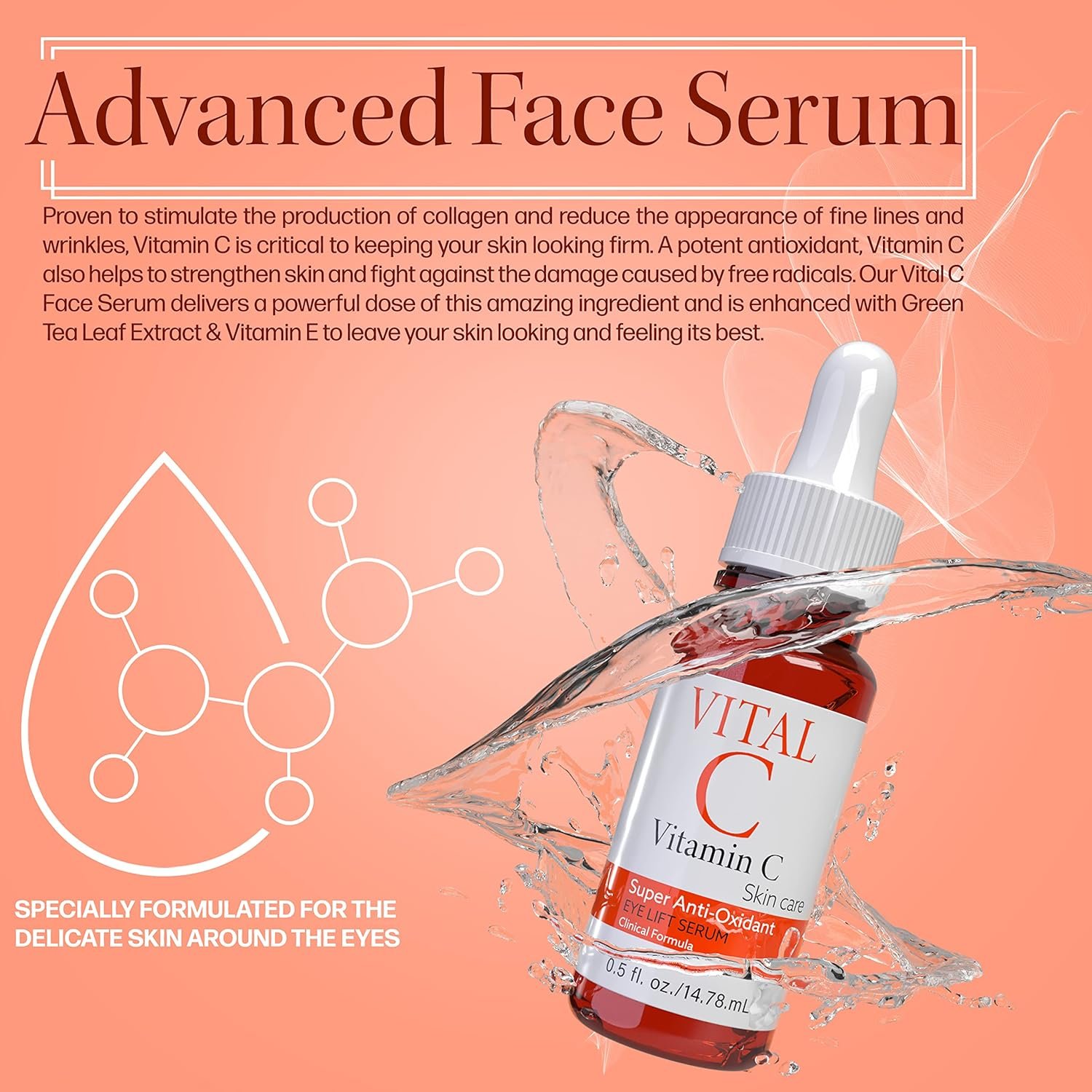 Specially-formulated for the delicate skin around the eyes, this moisturizing serum protects the skin against aging and sun damage with the power of Vitamin C. Our Vital-C Super Anti-Oxidant Eye Serum also contains ingredients that smooth and firm the skin thereby providing it with a noticeable “lift.”